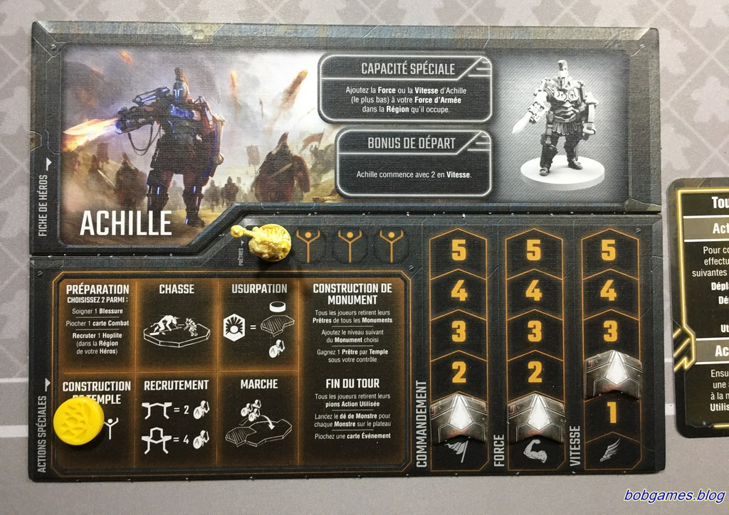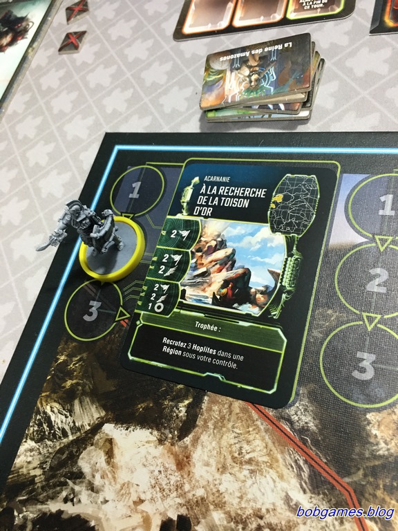 Bob se lance direct à la recherche de la Toison d’Or. Seul héros pouvant le faire rapidement, cette quête et son recrutement doré de 3 nouveaux hoplites est assuré dans 2 tours. Minh s’empare des régions aux alentours et recrute. Son armée commence déjà à faire peur. Stéphane et Stefano, positionnés au nord, commencent la récolte des cartes de guerre, essentielles pour la chasse.