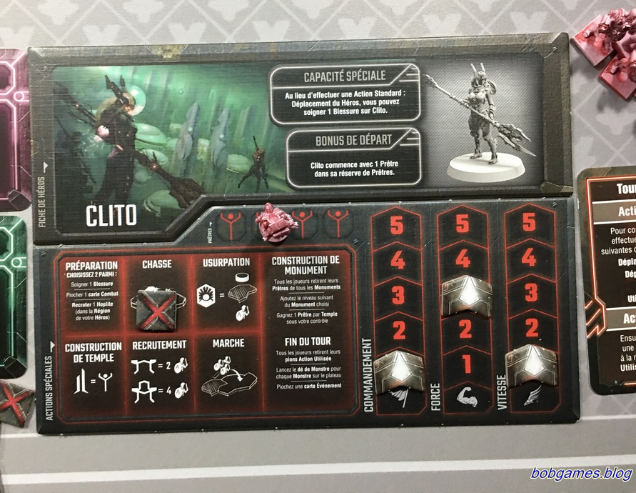 Minh est le premier joueur, il choisit Cassandre (en vert) comme héroïne et son puissant pouvoir de prise de territoire au début de la partie. Il ne s’en cache pas, Sparte sera sienne au premier tour ! Ensuite, Stefano choisit Héraclès (en bleu). La chasse aux monstres est d’ores et déjà lancée. Stéphane prend la Nymphe Clito (non ne rigolez pas… en rouge) afin de pouvoir se soigner toute seule. Pour lui aussi, la chasse aux monstres est lancée. Enfin, Bob décide se lancer dans la guerre. Achille (en jaune) sera son héros.