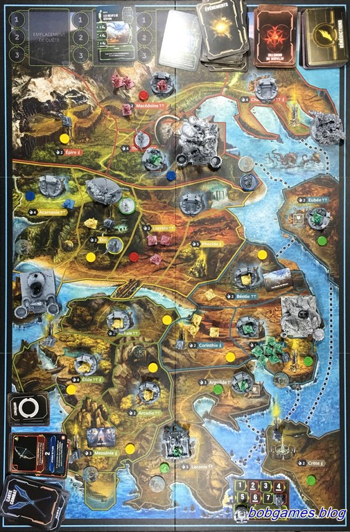 Première analyse du plateau, 4 monstres sont dans la partie nord de la Grèce et 3 quêtes sont bien réparties. Minh et Bob se sont positionnés au sud, loin des monstres, Stefano et Stéphane au nord, proches des monstres, leur gibier. 2 stratégies claires sont déjà posées, la conquête territoriale pour le sud et les trophées de monstres pour le nord.