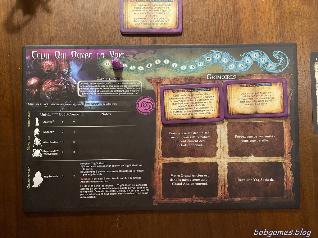 Mais d’abord, un poil d’explication du jeu et des factions. On est dans un jeu asymétrique de contrôle de territoires, de combats et de coups fourrés. A son tour, on peut faire une action payante (se déplacer, attaquer, construire un portail, capturer un adorateur adverse, recruter un acolyte, invoquer un monstre ou, enfin, réveiller un Grand Ancien) et autant d’actions gratuites que l’on veut (contrôler un portail et autres actions spéciales). Chaque action « payante » coûte des points de pouvoir, dont la collecte se fait au début de chaque tour en fonction des adorateurs en jeu et des portails contrôlés. Les riches très riches, les pauvres très pauvres ?? Non. Pour éviter qu’un joueur « largué » soit désavantagé, il bénéficiera toujours d’au moins la moitié (arrondie au supérieur) du total du meilleur joueur. On continue le tour entre joueurs jusqu’à ce que tout le monde ait passé. On effectue ensuite la phase funeste, où les points de victoire (appelés piste funeste) sont marqués en fonction des portails contrôlés et des coûteux rituels d’annihilation. Après cela on recomptabilise les points de pouvoir et on recommence. Vous avez tout compris ?