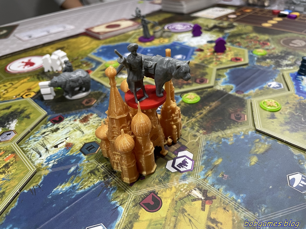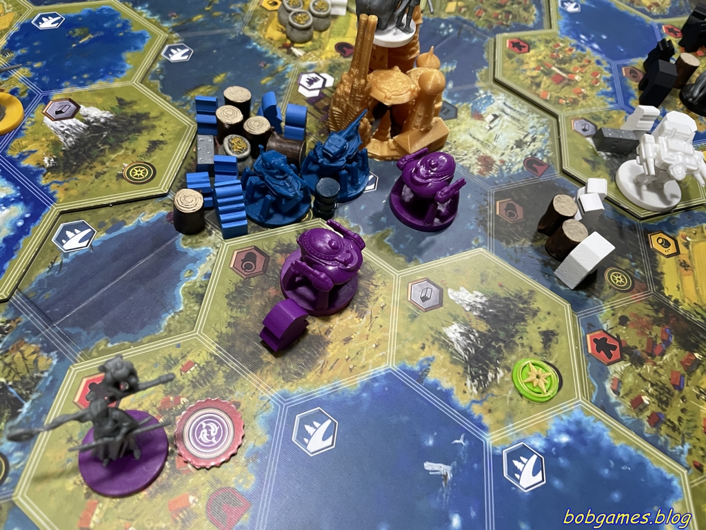 Et voilà. Après une saison sans ce grand jeu qu’est Scythe, on a enfin remis ce chef d’oeuvre dans la programmation des Bob Games. Et pour fêter ça, on a joué avec le plateau modulaire. Et oui. Fini la connaissance du plateau de base et le positionnement plus ou moins bon qui va avec. Ici, tout le monde découvre le merveilleux monde du hasard et son lot d’opportunités. Du coup, pas de dirigeables pendant cette partie pour pouvoir savourer au mieux cette nouveauté sans perturbations.