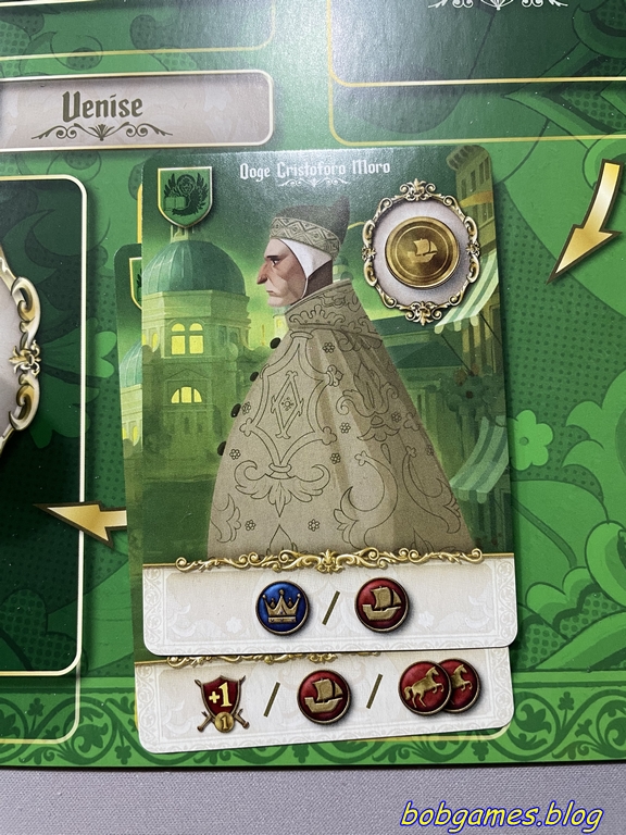 Le jeu comporte donc des cartes « courtisans » mais également des cartes « bonus de patronage » (qui donnent des avantages non négligeables en cours de partie ou donnent des points de victoire en fin de partie). Mais également des tuiles de cités (qui sont donnent des ressources comme un courtisan sauf que pour le retourner il faut « gouverner » la cité… vous comprendrez plus tard). Mais également des tuiles « titres », « guildes », « cathédrale » et « personnelles de famille que personne d’autre ne peut utiliser ». Bien évidemment, tout cela s’achète en cours de partie. Au début, à part la blague récurrente, vous commencez uniquement avec 3 membres de votre famille, apparenté à des courtisans dans leur utilisation (et un malheureux florin).