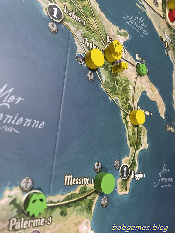Troisième constat, les déplacements sont chers. Déplacer des armées prend du temps (on ne peut le faire que sur l’action Guerroyer et il faut un petit cheval pour chaque armée et pour un seul déplacement). Du coup, Venise et ses bateaux deviennent intéressants mais encore faut-il le comprendre en première partie… et Bob ne l’a pas forcément compris (bien qu’il ait pris Messine assez rapidement). Quatrième constat, Intriguer est vraiment très puissant pour soi et nuisible pour les autres joueurs. On peut, grace à un agent, diminuer la force d’une ville en mode guerre ou en mode annexation. On peut, grace à un agent, augmenter la force d’une ville visée par un autre joueur pour lui ruiner ses plans. On peut également empêcher un joueur (et c’est là que l’agent est vraiment surpuissant et que la carte cheatée citée plus haut prend tout son sens) de faire une action sur sa roue d’actions !!!! Et pour enlever cet agent, il faut aller sur sa propre action Intriguer et donc cela prend du temps. Potentiellement, si les autres joueurs veulent vous bloquer, ils peuvent vous pourrir la partie très facilement. Cinquième constat, il ne faut clairement pas être des Bisounours… Non. Il faut dès le départ utiliser ses capacités de nuisances pour ralentir les autres et s’octroyer des avantages. Les 4 joueurs ont été timides et chacun s’est au départ focalisé sur son propre jeu. Erreur. Mais en même temps, peut-il en être différemment lors d’une première partie ?