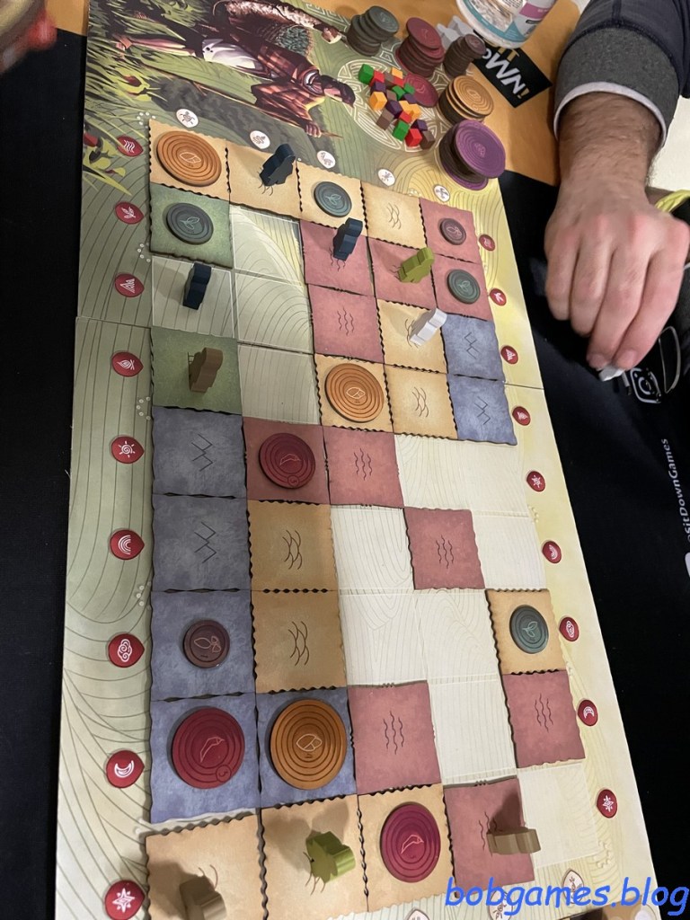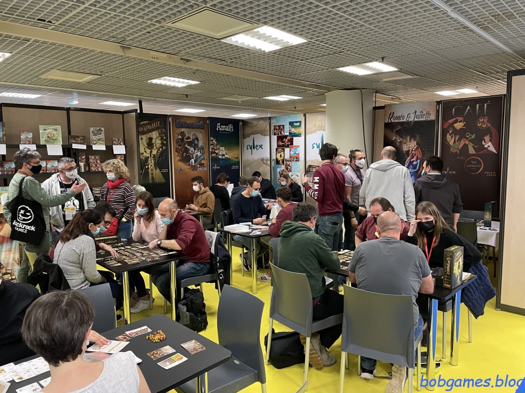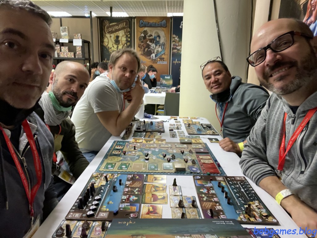 Bilan : c’est un brise-neurones, clairement. Si vous ne souhaitez pas réfléchir, vous allez vous retrouver comme les belges (en version Les Inconnus) dans le jeu des chiffres et des lettres… Pour les autres, l’analysis paralysis guettera mais vous passerez un bon moment, c’est très réussi et la roue Pachamama est intrigante, assurément. Pas d’achat sur place car le jeu n’est pas encore édité mais un financement participatif réussi a suivi le festival sur Kickstarter et le jeu sortira pour la fin de cette année. Pas de victoire car nous n’avons pas terminé la partie et Bob et Minh l’ont « financé » sur Kickstarter par la suite.