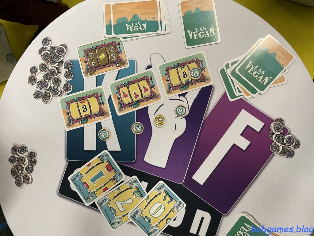Ca y est, le festival est plein. Malgré les mesures COVID, malgré l’absence très remarquée d’Asmodée et ses très nombreux éditeurs, les allées sont pleines de monde. Il n’y a plus de places sur les tables. Il faut attendre. Et ça fait du bien 😀 En effet, cette ambiance manquait et les joueurs et joueuses que nous sommes avons besoin de cettte folie ludique. Encore une fois, merci aux organisateurs du FIJ pour cette belle édition. Bon, quand les tables sont pleins, si vous nous suivez régulièrement ou si vous avez l’habitude de ce genre de festival, il est temps d’attaquer les petits jeux mais non moins malins et intéressants. On va direct chez Kyf Edition car on aime cet éditeur qui arrive à proposer toujours des jeux super sympas pour un minimum de règles et un budget limité. Et cette année, c’est Las Vegan qui est à l’honneur. Aller, c’est parti.