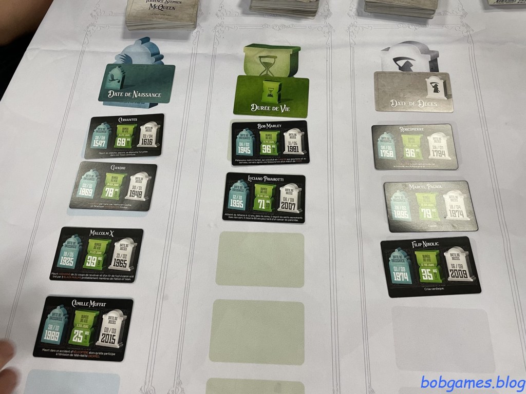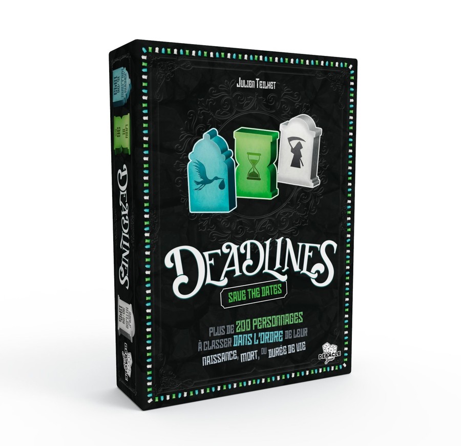 Deadlines, proposé par Débâcle Jeux, nous attire vers lui irrémédiablement. Un jeu macabre, à la manière d’un Cardline. Oui. Ici, le but est de classer des personnalités « mortes » selon leur date de naissance, date de décès et « durée de vie ». Ce classement s’effectue sur 3 colonnes.