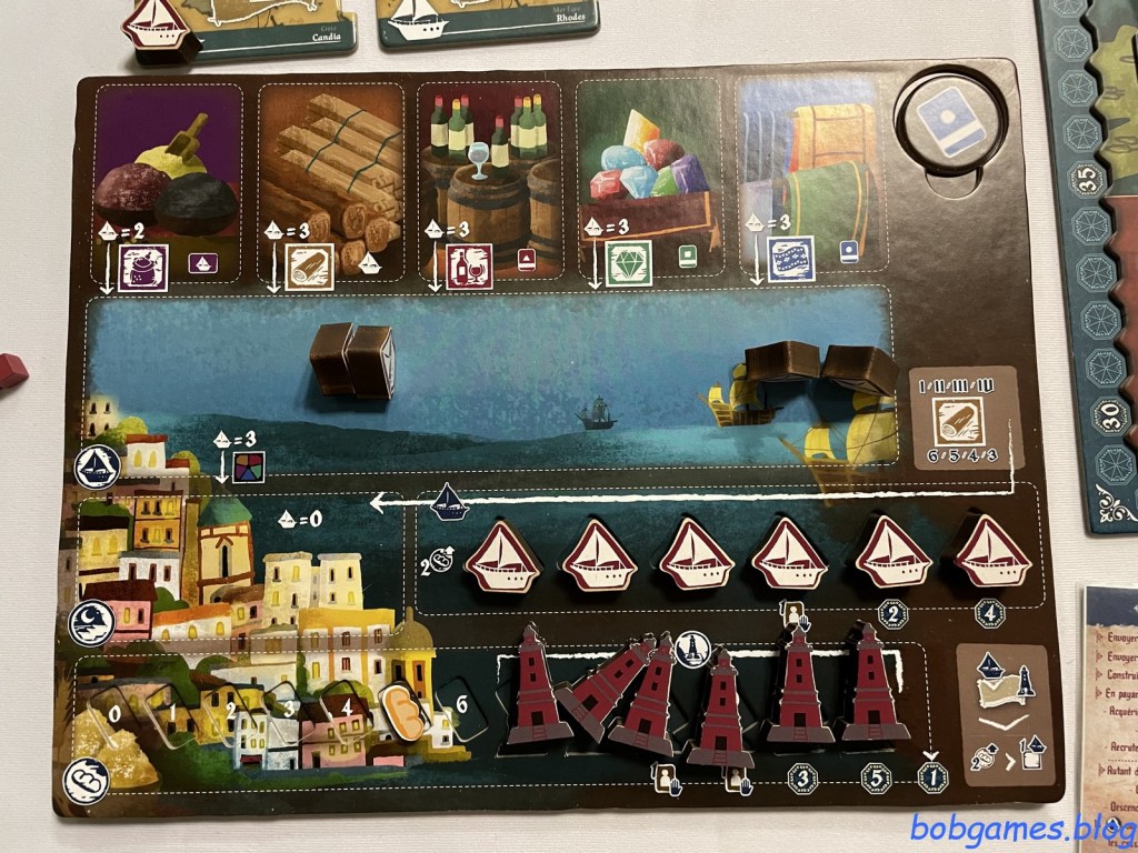 Evidemment, il faudra aller chercher des nouveaux bateaux pour accroître les actions possibles lors d’un tour. La partie se joue sur 4 tours complet et des coûts d’entretien doivent être payés en fonction du nombre de bateaux possédés (et oui, ça s’entretient un bateau). Petit côté sympa, les bateaux servent aussi de marqueurs de ressources et donc sont bloqués jusqu’à ce qu’on utilise ces ressources.