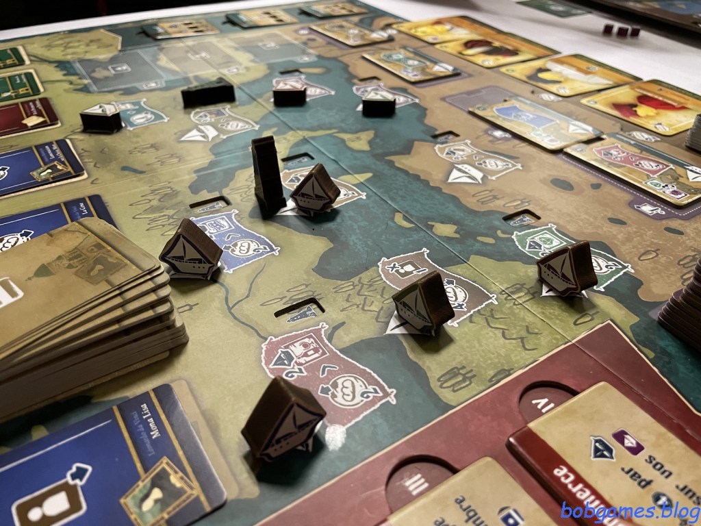 Retour chez nos amis de Sylex avec un « gros » jeu en cours d’édition à tester. Amalfi Renaissance nous tend les bras et on s’installe gentiment autour de la table. Amalfi, c’est un ancien port commercial de la région italienne du Salerne. Le but du jeu consiste à rétablir la prospérité de cette ville avec notre flotte commerciale. On est clairement sur du jeu de gestion en version « pose de bateaux » sur des cases donnant des ressources. Ces ressources permettront notamment d’acheter des cartes action qui donneront accès à des cases « privées » plus rentables que les cases communes ou encore des contrats profitables ou encore payer des personnages.
