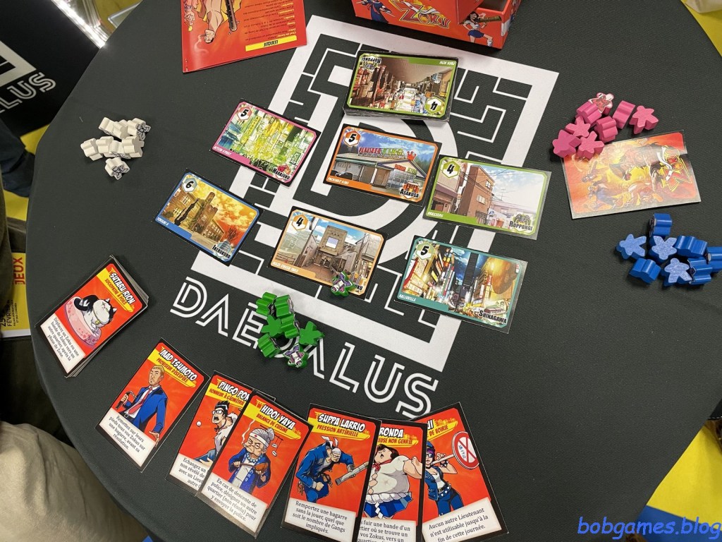 Tchi et Stéphane ayant préféré l’appel du pub, nous ne sommes plus que 3 à déambuler dans les allées du FIJ. Arrivée sur un stand rempli de couleurs, une table est libre. Zoku, édité chez un petit éditeur qui mérite à être plus connu, Daedalus.