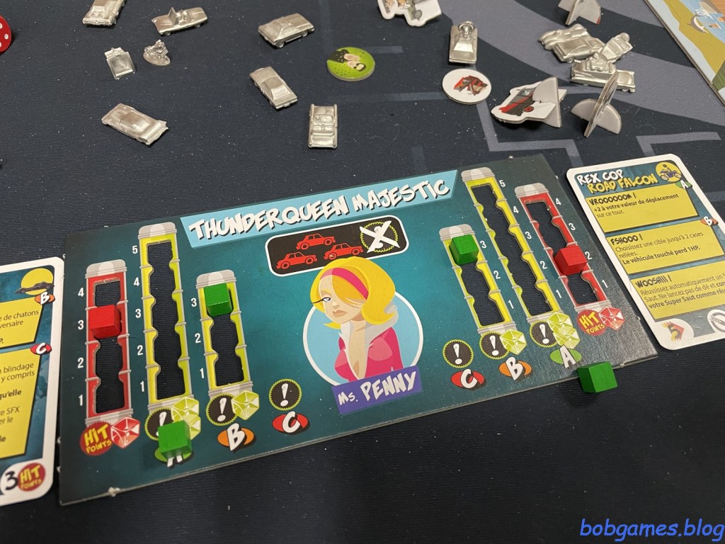 Bilan : c’est excellent ! Un joli jeu avec des références années 80 (très à la mode en ce moment) avec des règles simples et des parties rapides et tendues. C’est une vraie réussite. Avec la quantité de matériel et la diversité des circuits (recto-verso) et des pilotes, la rejouabilité est assurée. Pas d’achat (mais grosse hésitation de Bob) et victoire de Stefano.