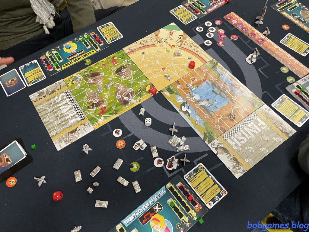 Bilan : certains vont trouver ce jeu « moche », d’autres « un pari graphique osé ». En dehors d’une esthétique discutable, le jeu est une réussite pour un public non-initié. C’est facile à comprendre et très légèrement stratégique. On s’amuse bien. Pour un public averti, c’est exactement la même sensation, sauf qu’ensuite on ne vas pas y revenir, c’est sympathique mais rien de plus. Victoire de Minh et achat quand même pour Stéphane.