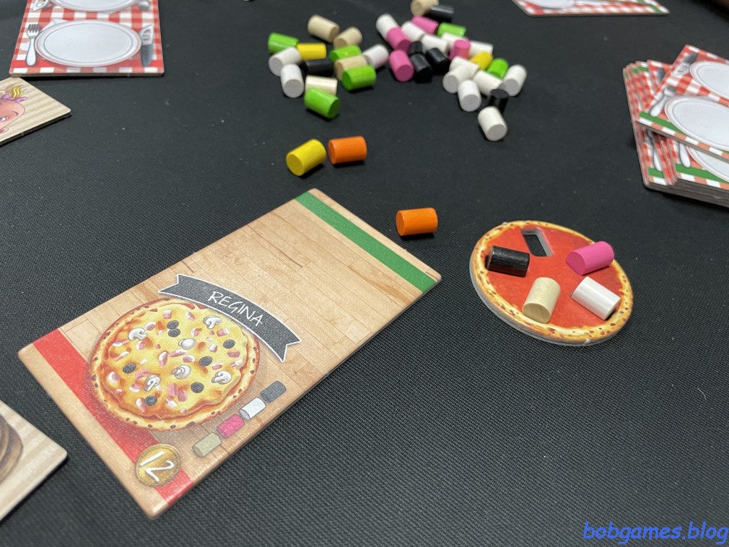 Le FIJ ferme. Vite une dernière partie ! Pizza Rush chez Belugames nous ouvre l’appétit. Nous sommes les gérants d’une nouvelle pizzeria et les clients affluent en nombre. Il faut les accueillir, prendre les commandes, préparer les pizzas et les servir, encaisser l’argent et les précieux pourboires. Voilà le programme.