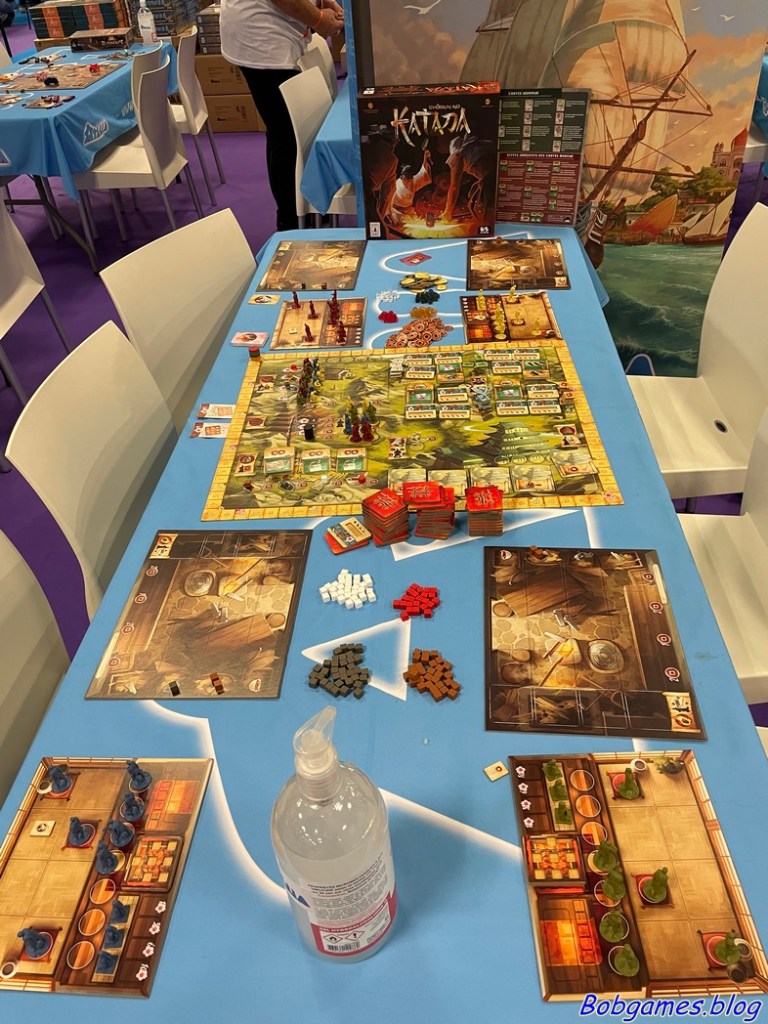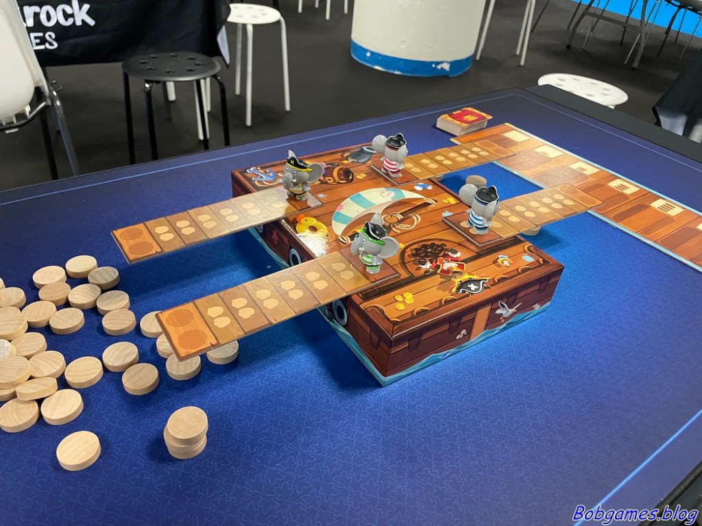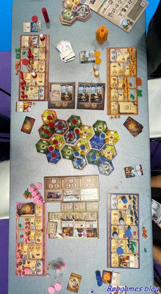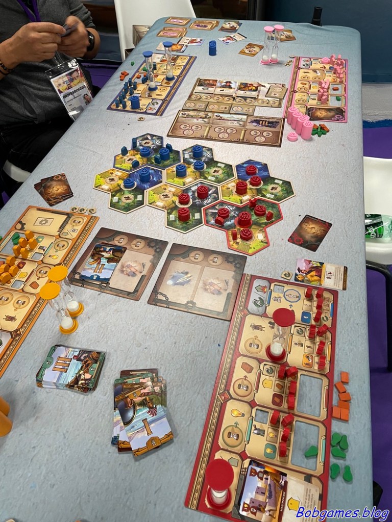 Bilan : le chaos règne en maître sur ce jeu et c’est bien dans cela que ce jeu ne conviendra pas à tous. L’erreur de jeu est probablement omniprésente (en tout cas dans les premières parties) et peut avoir des répercussions sur le déroulement du jeu. Mais sinon, c’est vraiment une réussite ludique. Arriver à vivre tant d’émotions sur un jeu qui ne dépassera pas l’heure de jeu à 4 joueurs (en comptant les décomptes), c’est vraiment fort. Ici, pas de paralysis analysis et rien que pour ça, ce jeu mérite de l’attention (on a tous dans nos groupes de jeux un membre de ce culte étrange de la paralysie d’analyse… mais c’est toujours les autres, c’est jamais nous-même). Victoire écrasante de Minh et pas d’achat (et pas d’hésitation de Bob… pour le moment). A noter que cette mécanique d’action par des sabliers existait déjà avec un jeu pour enfants, Une Histoire de Pirates, testé au FIJ en 2019, mais avec une mécanique coopérative.