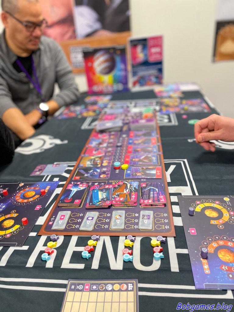 Bilan : on est face à un classique jeu « expert » de gestion de ressources mais surtout d’enchaînement de combos entre les différents mécanismes du jeu. Le jeu est beau (mais faut pas se sentir agressé par les couleurs) et le tout tourne parfaitement bien, Galileo Project est une belle réussite permettant des parties rapides (1h40 avec les règles avec 4 joueurs!) et dynamiques. 2 bémols toutefois : le thème est clairement plaqué, cela nuit du coup à l’immersion dans ce joli univers, et il y a peu d’interaction entre les joueurs (à part la course aux objectifs et le choix des cartes). Le jeu est donc très « mécanique ». C’est assumé et cette mécanique est très bien huilée, donc ça passe très bien. Victoire de Bob et pas d’achat (mais Bob hésite encore…).