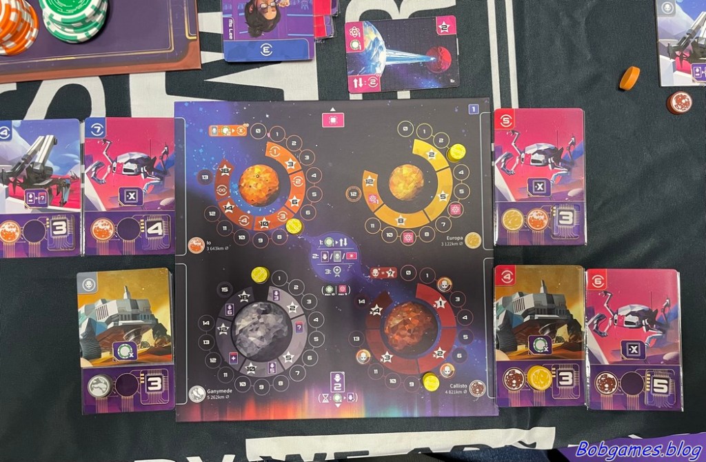 Chaque satellite de Jupiter aura sa spécificité de développement : Io est spécialisée dans la réduction des coûts, Europe se consacre aux avancées technologiques, Ganymede facilite le recrutement et l’efficacité de vos Personnages et Callisto permet de concevoir et de renforcer vos Robots. Il faut savoir jongler habilement sur chaque satellite pour créer la « machine » à points et à combos parfaite. Grande particularité du jeu, le changement d’influence (payant bien sûr) entre la Terre et Mars qui permet d’utiliser des capacités différentes des experts et des robots en fonction de leur faction d’origine. Malin.