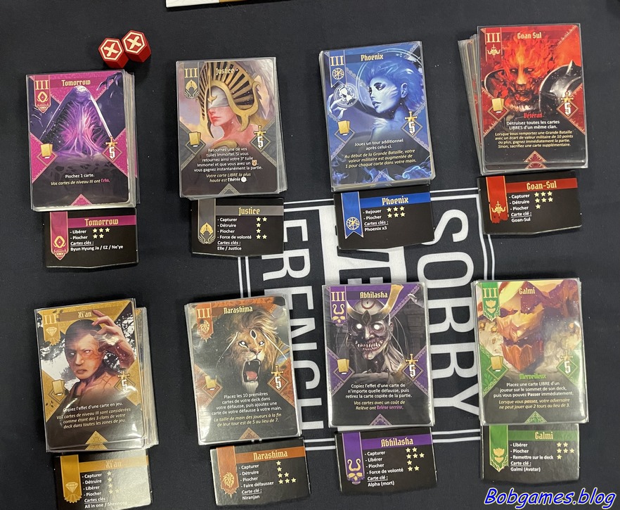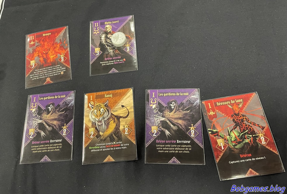 Une fois les armées prêtes, c’est le champ de bataille. On va simplement compter les valeurs militaires de ses cartes (2 points pour les niveaux I, 3 pour les niveaux II et 5 pour les niveaux III). Le but du jeu étant de remporter 2 grandes batailles ou, pour les plus stratégiques, de débloquer son 5ème jeton d’activation ou de contrôler 15 cartes dans son armée. Il y a également des Immortels qui proposent des conditions de victoire alternative. Après une bataille, s’il n’y a pas de grand vainqueur, un nettoyage des morts de son armée se fait, appelée le Chant des Morts, où chacun va devoir sacrifier la moitié de son armée (en gros, on supprime la moitié de ses cartes, arrondi au supérieur).