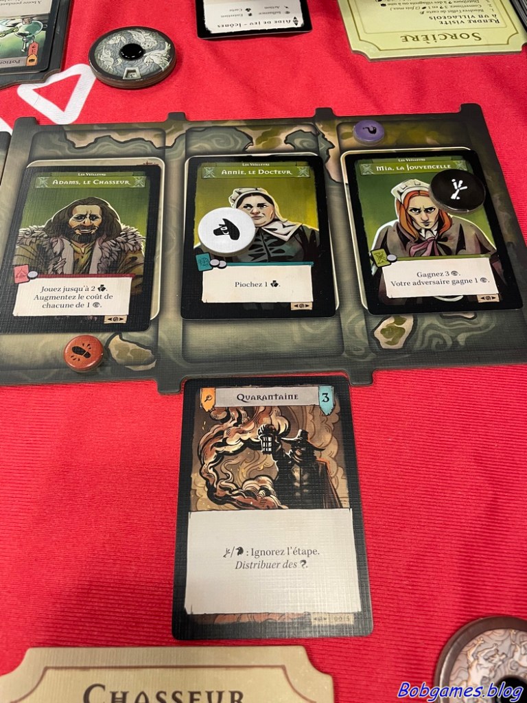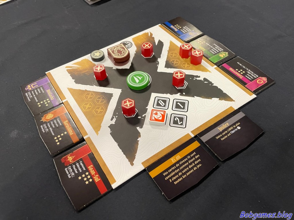Bilan : l’asymétrie est bien présente et il faut admettre que l’on s’est bien amusé, au début, à jouer notre propre personnage, ses cartes et ses mécaniques. Mais, au bout d’un moment, une certaine lassitude s’est installée. On passe notre temps à tenter de submerger son adversaire avec soit des secrets, soit des enquêtes réussies. Et le job consiste à démolir ce qu’entreprend son adversaire du jour jusqu’à ce que la stratégie de l’un dépasse celle de l’autre. On a arrêté en cours de route, même si Minh avait un léger avantage sur Bob. Pas d’achat et sentiment mitigé.