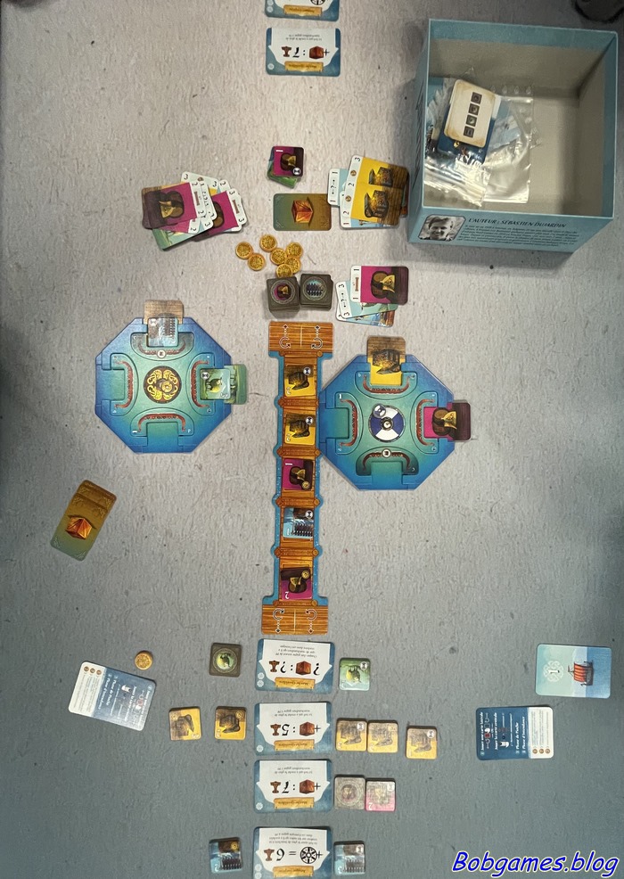 Bilan : un GRAND OUI à la mécanique du jeu ! C’est innovant et c’est beau. Mais c’est « tête dans le guidon ». Mais l’interaction indirecte y est assez forte (on peut contrôler ce que recherche son adversaire et lui piquer). Mais la rejouabilité est importante car il y a 8 cartes « entrepôt » (et seules 4 sont jouées au cours d’une partie). Mais il faut être torturé pour jouer à un jeu comme ça car on pense et réfléchit à chaque instant. Victoire de Bob (qui avait mieux lu les conditions de scoring) et pas d’achat (mais encore une fois, Bob a hésité… ça doit être maladif).