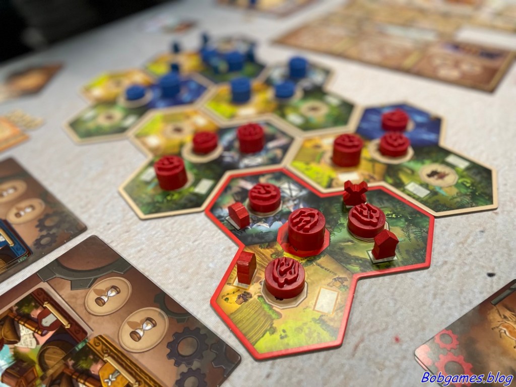 Une application obligatoire est nécessaire pour rythmer la partie (les 9 minutes), donner une touche d’immersion avec une bande son appropriée, annoncer les naissances de l’empire et enfin aider aux différents décomptes. Sinon, c’est un classique jeu de gestion de ressources, de prise de territoire et de stratégie sur le « court » long terme. Fait amusant, on peut attaquer son adversaire sans qu’il s’en rende compte, s’il se retrouve trop obnubilé par ses actions du moment.