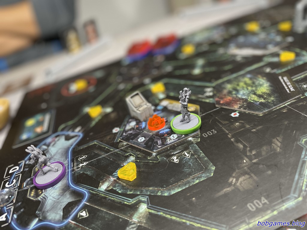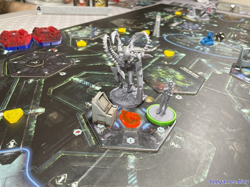 Nemesis se déroule dans un vaisseau spatial en perdition, infesté d’extraterrestres hostiles. On ne peut pas les appeler Alien pour des questions de droits, mais c’est clairement inspiré de cette merveilleuse saga. Chaque joueur incarne un membre d’équipage, avec ses propres objectifs secrets. L’objectif principal est de survivre et de s’échapper vivant du vaisseau… Qui de Bob, Minh, Stefano ou Stéphane y est parvenu ? Réponse en 8 photos.