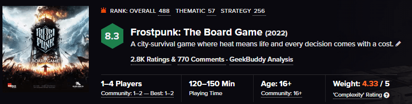 Une lointaine 488ème place mais quand on considère que le jeu dépasse aisément les 100 euros ou francs suisse ou dollars, en gros c’est un jeu de niche, c’est un sacré exploit ! Les 2800 votes lui donnent quand même une note de 8.3 et c’est hallucinant. Autre statistique intéressante, les joueurs déconseillent largement ce jeu à 3 ou 4 joueurs et estiment à 71.8% que le jeu est mieux en solo et à 50.6% qu’il est mieux à 2. cqfd.