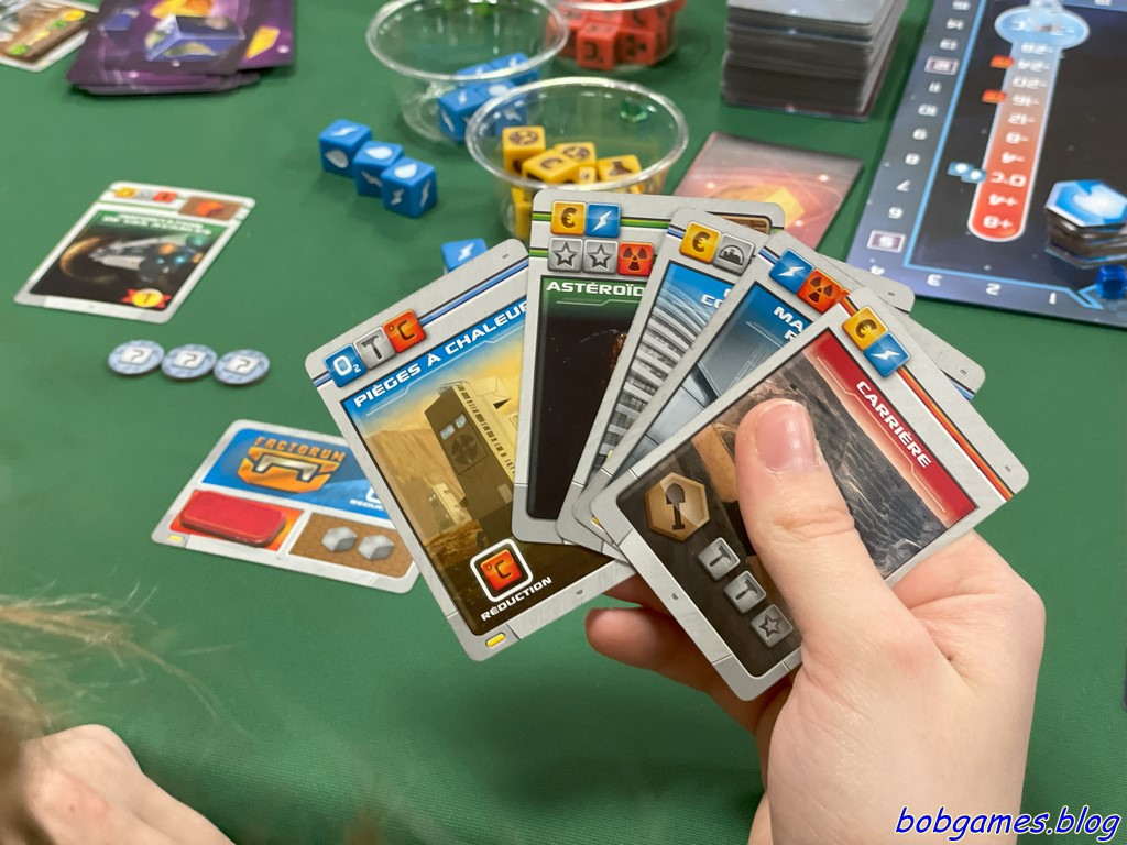 A son tour, on a le choix entre 2 actions : soit on produit avec nos cartes de production (et on en profite pour changer de cartes), soit on effectue une action de soutien (une action pour chercher un dé ou pour modifier la face d’un dé) et une action principale (du genre poser une carte, dépenser de la chaleur ou refaire une action de soutien).