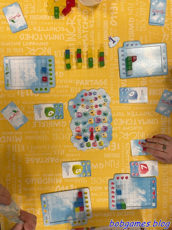 Toujours seul en recherche d’une table, je me pose chez Iello avec trois personnes plus âgées que moi (oui, ça peut commencer à devenir rare…). Le jeu est beau et il y a plein de dés de couleur. C’est Balloon Pop et c’est un tetris à l’envers.