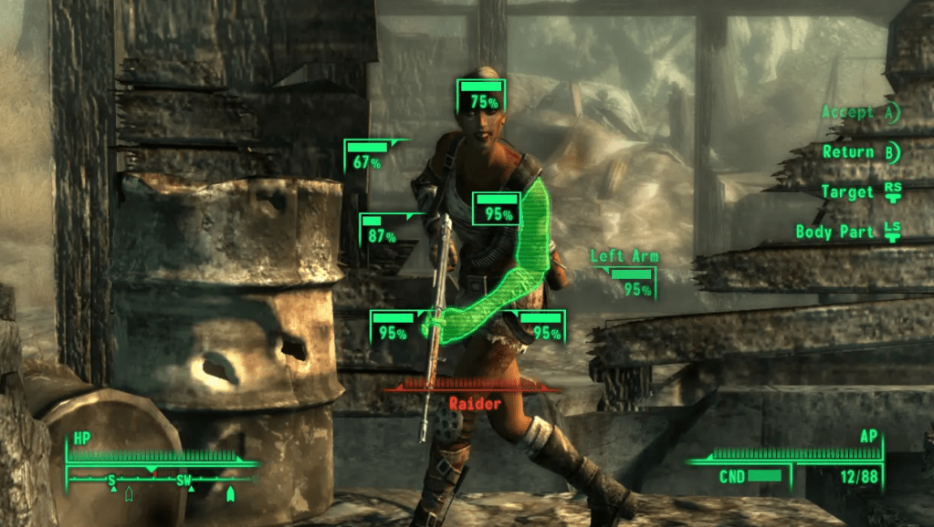 Niveau gameplay, Fallout 3 a introduit le système VATS (Vault-Tec Assisted Targeting System). Un mélange de combat en temps réel et de combat au tour par tour. En gros, on pouvait arrêter le temps pour cibler les parties spécifiques des ennemis, ce qui rajoutait une dimension stratégique super fun. On se retrouvait à planifier nos attaques, à choisir entre viser la tête pour un coup critique ou les jambes pour ralentir un ennemi. C’était vraiment satisfaisant et donnait un feeling unique aux combats.
