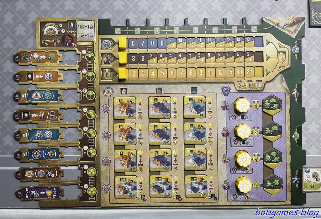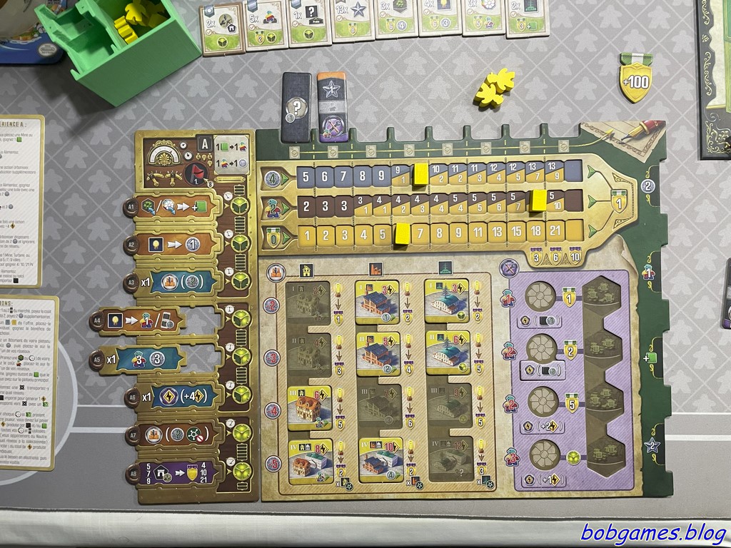 Les réalisations, késako ? Ce ne sont pas des points de victoire mais des aboutissements d’actions d’illumination des bâtiments. On peut aussi en gagner avec des tuiles actions ou avec des arbres de technologies. Ces réalisations sont représentées par des étoiles et elles seront utilisées à chaque recharge, permettant de poser un marqueur jalon dans la piste des jalons. Ces marqueurs permettront de marquer des points en fin de partie. Autre point important du jeu : il existe des pistes de revenus que l’on peut améliorer tout au long de la partie et que l’on touche à chaque recharge. Voilà pour l’explication sommaire des règles, que vous pouvez d’ailleurs facilement trouver sur le net (mais en anglais).