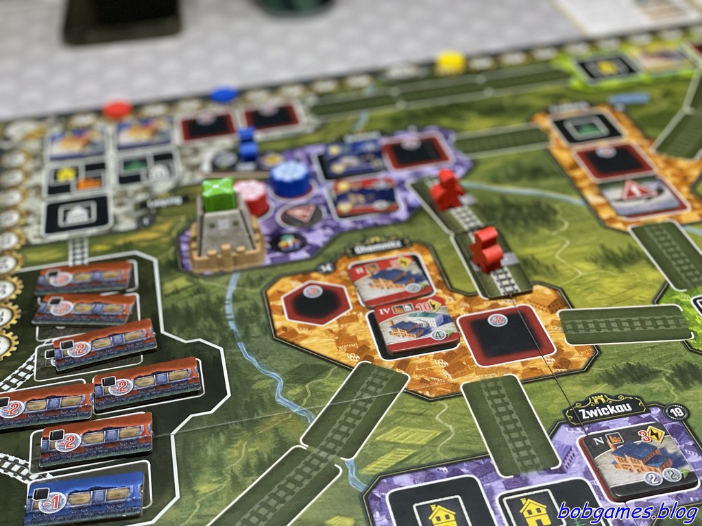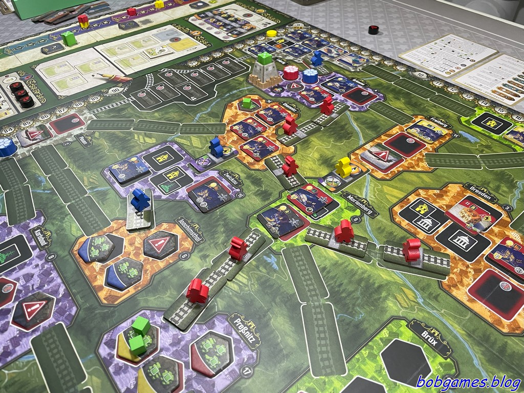 Revenons à Nucleum et à la partie. Alors que Tchi prit possession de la prospère ville de Leipzig, Minh s’aventura en terres inconnues vers le sud-est, développant son réseau ferroviaire à outrance. Il y eut bien quelques frictions entre eux au moment de chercher des emplacements de mines, mais rien qui a conditionné de manière négative la partie de l’un ou l’autre. Le jeu est exigeant mais n’est pas punitif. On ne va pas se retrouver bloqué pour des histoires de rails (je pense clairement à Brass Birmingham, mais quelle horreur). Bob s’est lui amusé à tisser une toile de rails la plus large possible, laissant par-ci par-là des mines, turbines ou bâtiments, qu’il s’empressait d’éclairer le plus vite possible. Cette stratégie paya car, en effectuant une recharge bien positionnée en terme de jalon, il récupéra le précieux Nucleum et le positionna sur Zittau. L’empire électrique à base d’uranium venait d’exploser dans la Saxe orientale. Plus jamais cette région ne se retrouverait dans la pénombre.