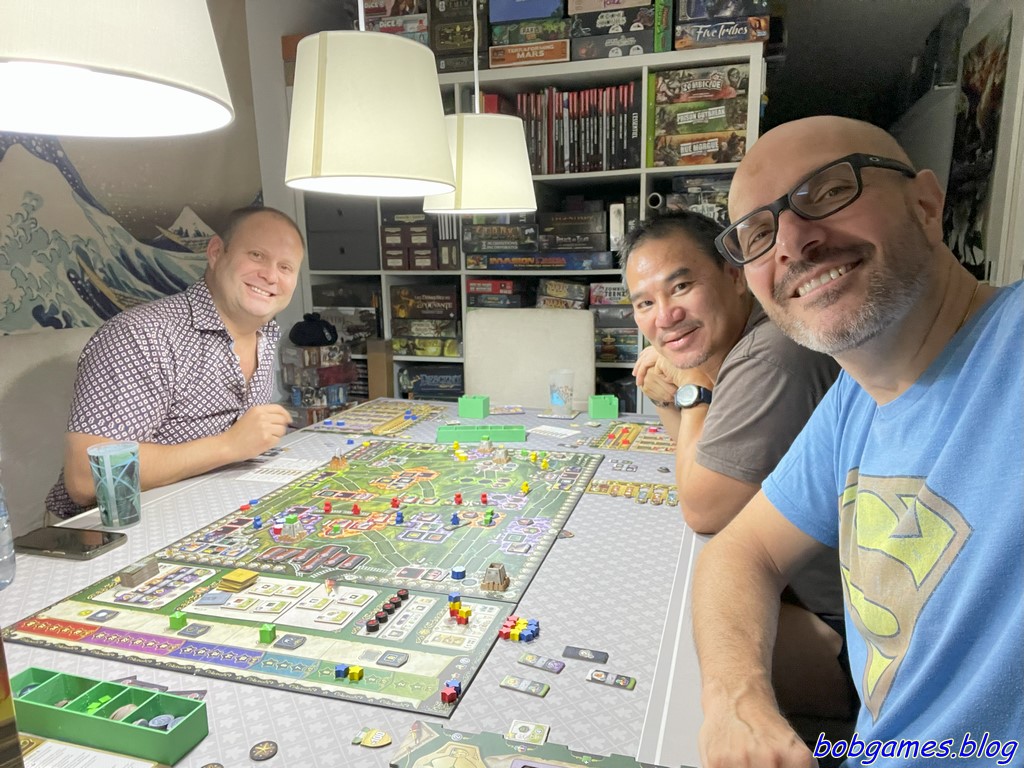 Et soudain, la première condition de fin de partie tomba. Rappel : à 3 joueurs, il en faut 2 pour clore le jeu. Tout le monde se regardait d’un coin des yeux. Il ne fallait plus grand chose pour que la partie s’arrête car à la prochaine action de développement, la partie prendrait fin. Bob se décomposa intérieurement, il avait fait une erreur car il ne possédait plus de tuiles pour urbaniser et il devait forcément construire pour réussir son objectif principal de technologie. Il réfléchit (longuement) et aborda une manœuvre d’industrialisation, d’alimentation et d’urbanisation (grâce à la sainte tuile d’action bonus). Il pria pour que personne ne mette fin à la partie trop vite. Mais Tchi en décida autrement. Il conclut la partie à son avantage, laissant Bob et Minh au dépourvu. Oui, c’est aussi une course.
