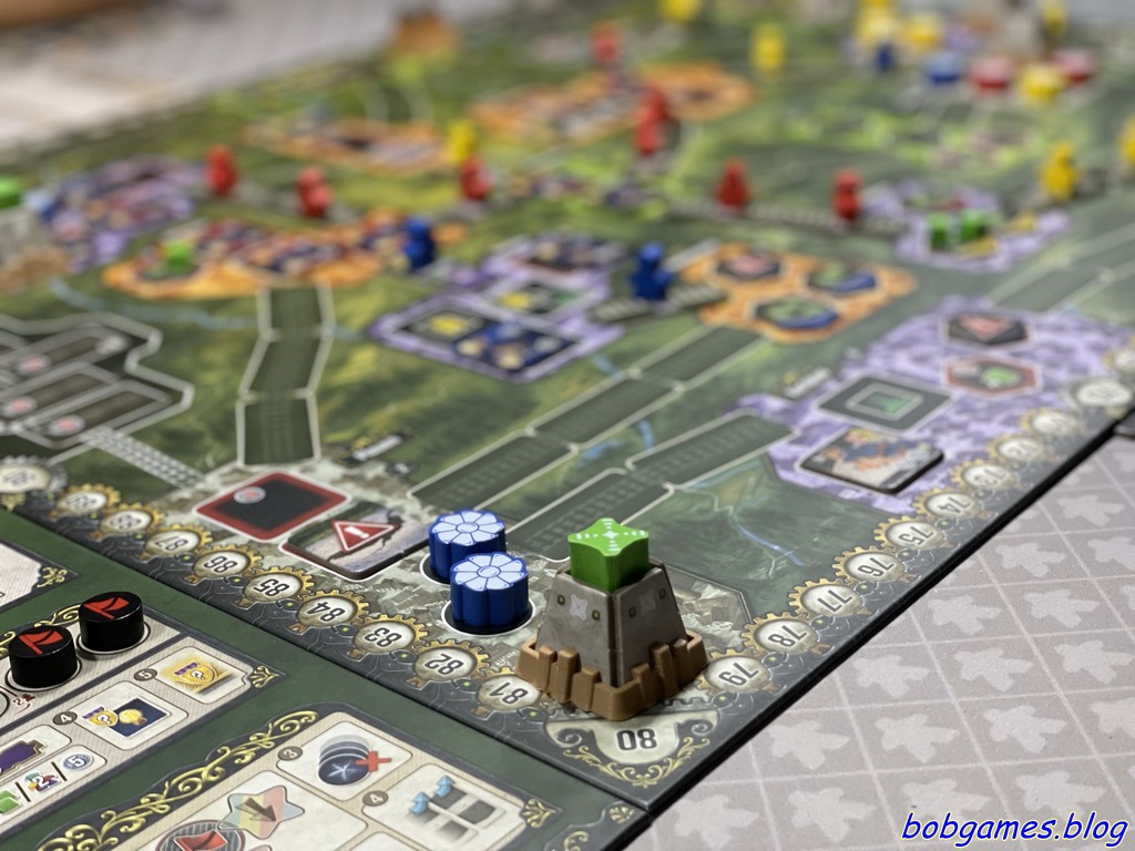 Tchi développa ses bâtiments comme personne. Sa capacité à les illuminer et à en tirer de substantiels avantages le firent galoper en tête. Mais il n’était pas seul car Bob chevauchait avec lui, tirant profit de l’énergie pas chère qu’il était en mesure d’acheter et de produire. Minh était plus en mode diesel, attendant de faire chauffer sa « stratégie » avant qu’elle ne se déploie. Les tactiques de chacun furent réparties en 2 clans : le clan des nombreuses recharges pratiquées par Tchi (4 en tout sur la partie) sans poser trop de rails, et le clan des nombreux rails et des tirages en longueur des tuiles d’action par Minh et Bob (seules 2 recharges chacun).