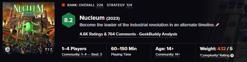 Nucleum est un excellent jeu. Il offre une profondeur stratégique riche, où chaque décision a un impact important sur l’issue de la partie. Les joueurs doivent planifier leurs actions avec soin, tout en gardant un œil sur les adversaires et en optimisant leurs ressources, ce qui rend le jeu intellectuellement stimulant. Le thème, centré sur l’essor de l’énergie nucléaire dans une Europe alternative, est bien intégré aux mécaniques de jeu, ce qui renforce l’immersion et donne un sens à chaque action.