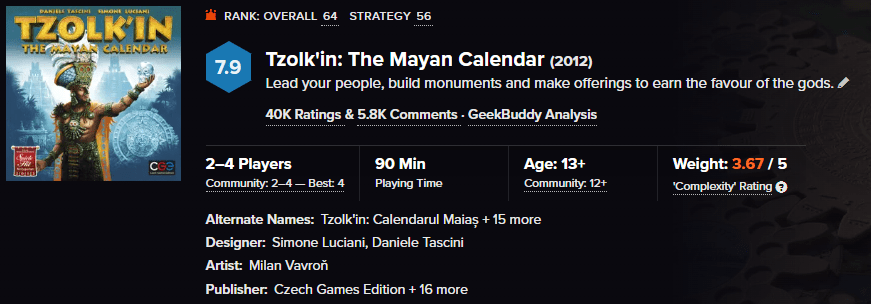 Sur BGG, une très honorable 64ème place mondiale, pour plus de 40’000 votants et un poids de 3.67. Oui, Tzolk’in est déjà un monument du jeu de société après plus de 12 ans de bons et loyaux services.