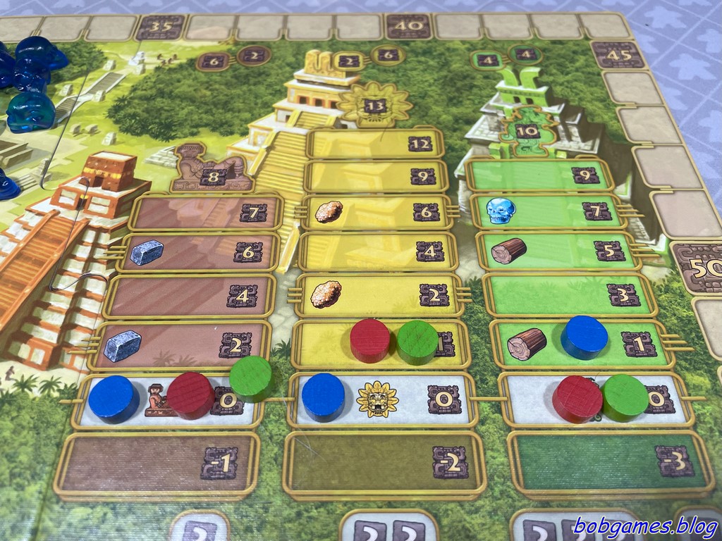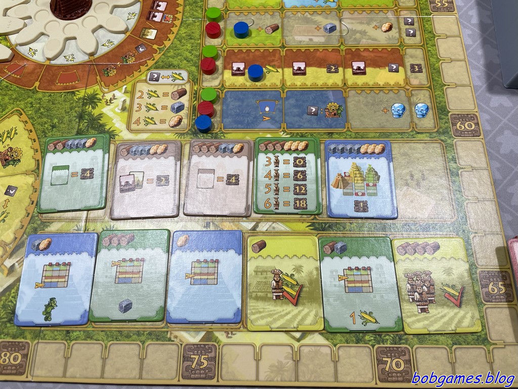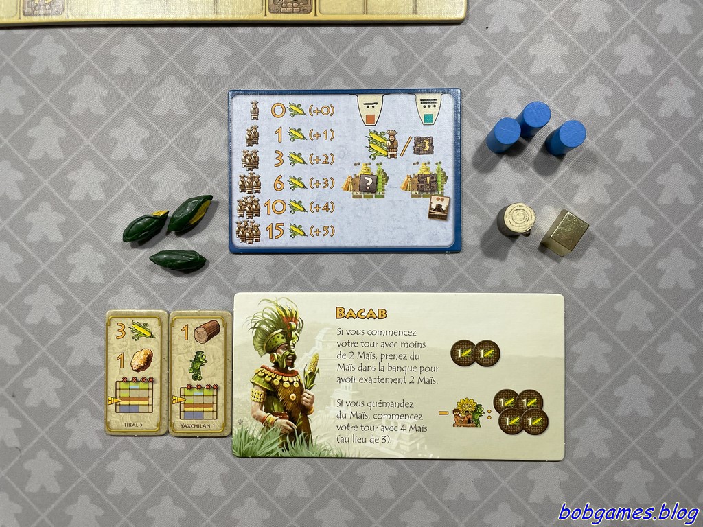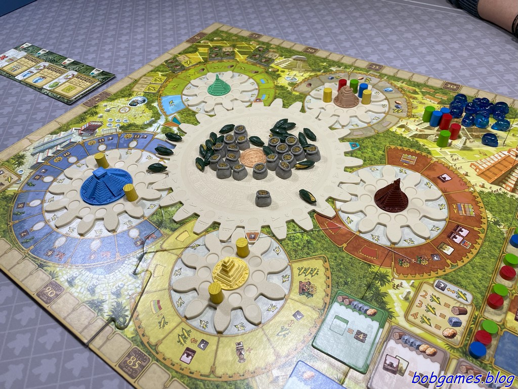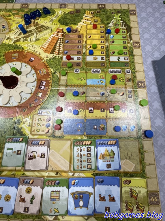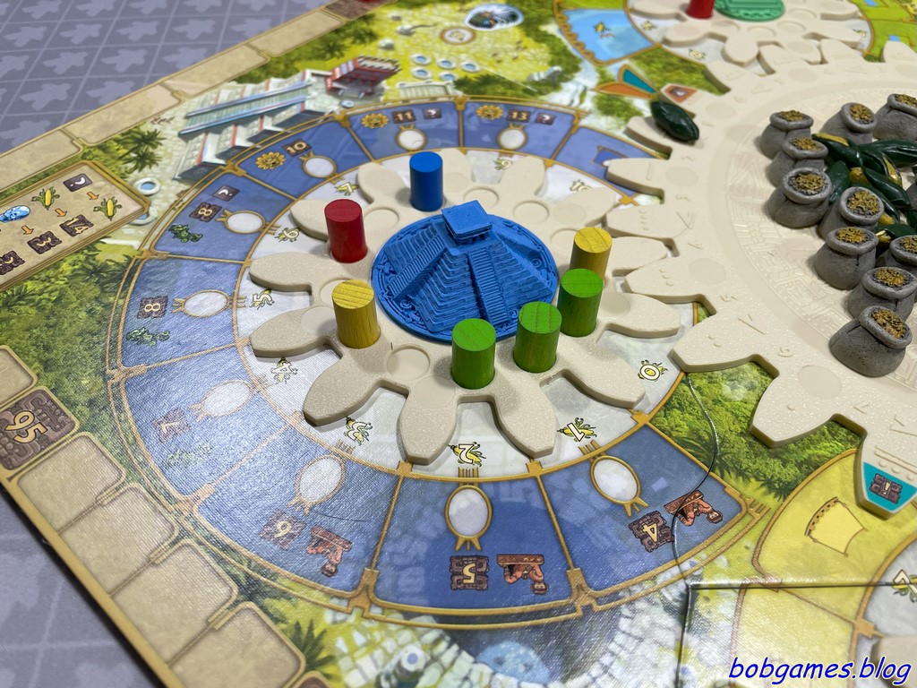 Les joueurs doivent constamment évaluer leurs options : quand placer leurs ouvriers, combien de temps les laisser sur le plateau pour maximiser leur efficacité ou encore comment anticiper les mouvements des autres joueurs. Oui, jouer en premier est important et oui, jouer en dernier coûte cher en maïs. Cette nécessité de réflexion approfondie mène inéluctablement vers une analysis paralysis. Et c’est long. Très long. Chaque décision est soigneusement pesée et mûrement réfléchie. Et cela allonge la durée des parties, surtout si chacun s’efforce d’atteindre le meilleur résultat possible. A bon entendeur…