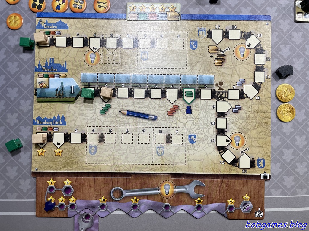 Bob s’est donné comme objectif du jour de prendre des conducteurs, de tenter le charbon et d’y aller à fond sur l’usine. Et il l’a fait. Tout le monde se souviendra de son coup « combo » qui a duré plus de 10 minutes et qui a fait perdre patience à Stefano. Un amoncellement d’actions qui se sont succédées grâce au charbon, qui a déclenché une idée, qui en a déclenchée une autre, qui a fait avancer le rail pour découvrir 2 plateaux modulaires, pour ensuite redéclencher l’usine. Bref. Magistral. Mais German Railroads ne pardonne pas. Bob a choisit le chemin de la simplicité en allant rejoindre Berlin et non pas Hamburg (et son beau rail doré, valant plein de points). Quelle erreur. Cela a laissé le champs libre à Minh. Bilan : 2ème avec 367 points.