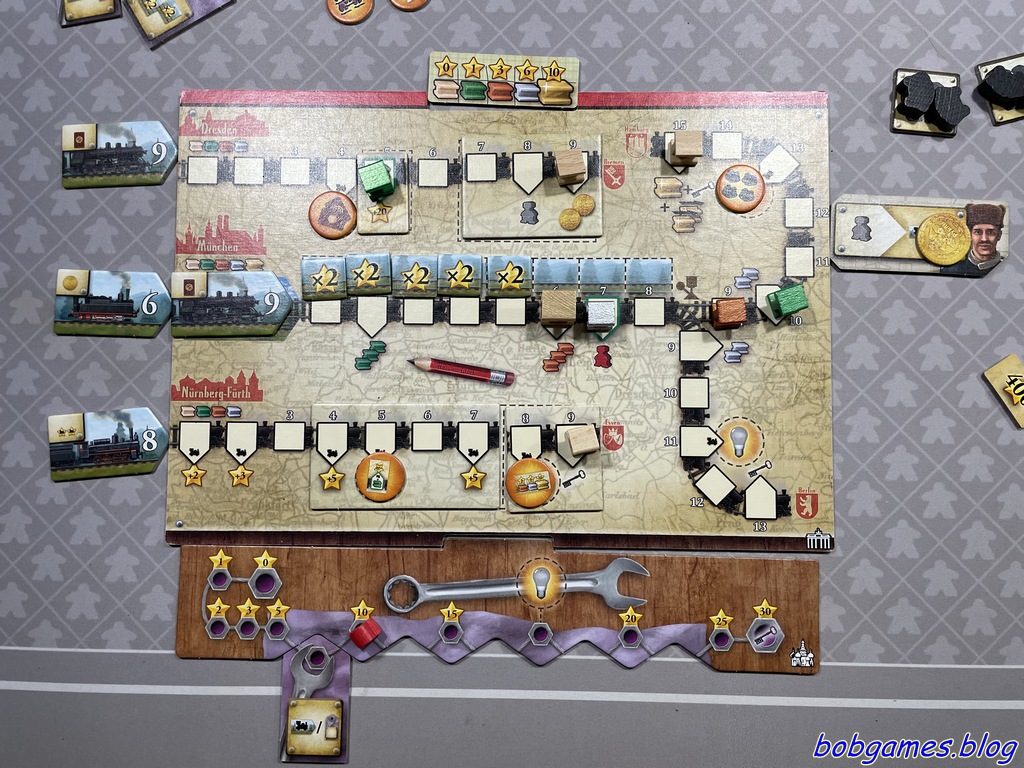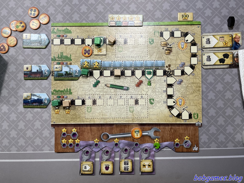C’est comme Russian Railroads, mais avec quelques petits changements, notamment les plateaux modulaires et le choix de la destination finale. On va pouvoir choisir quelle stratégie on souhaite mettre en avant au fil de l’avancée de la partie : plutôt les nouveaux jetons à cadeaux ? les idées ? de nouveaux ouvriers plus rapidement ? une machine à scorer des points ? ou encore un boost pour l’usine ?