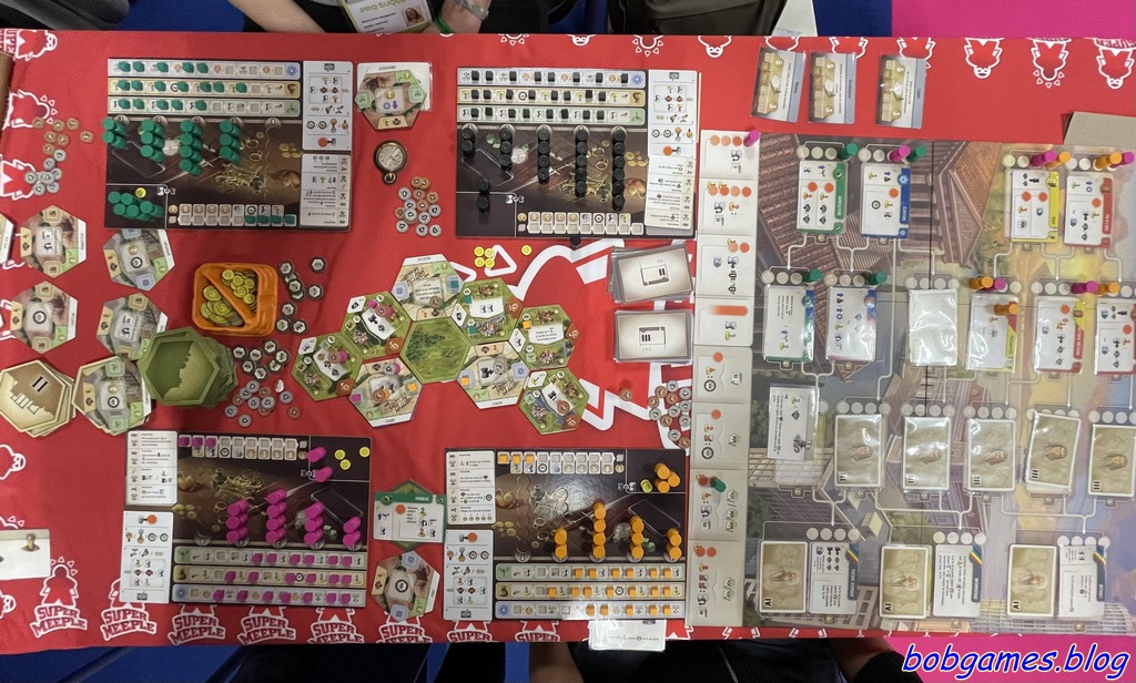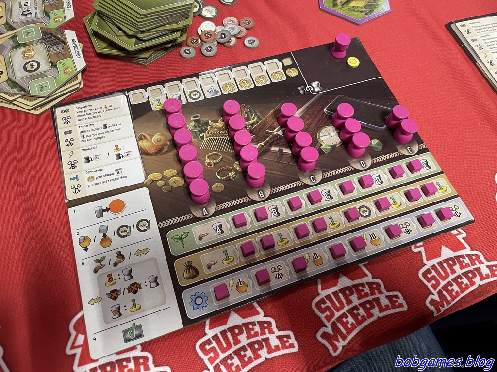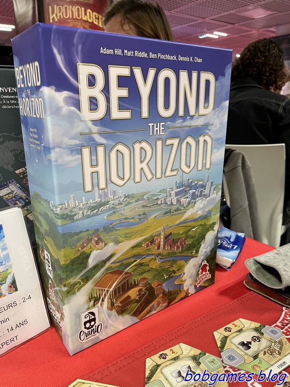 Finalement, c’est Beyond the Horizon qui nous offre une belle table, chez Super Meeple. C’est la rethématisation de Beyond the Sun (numéro 97 mondial chez BGG quand même). Ici, pas d’espace intersidéral, mais un développement classique de civilisations sur la Terre, avec l’arbre des technologies qui va bien et une partie d’exploration.