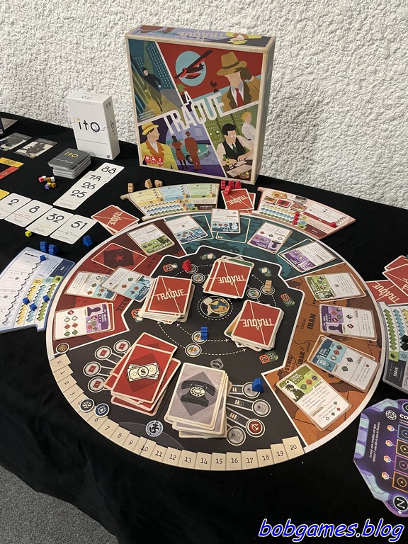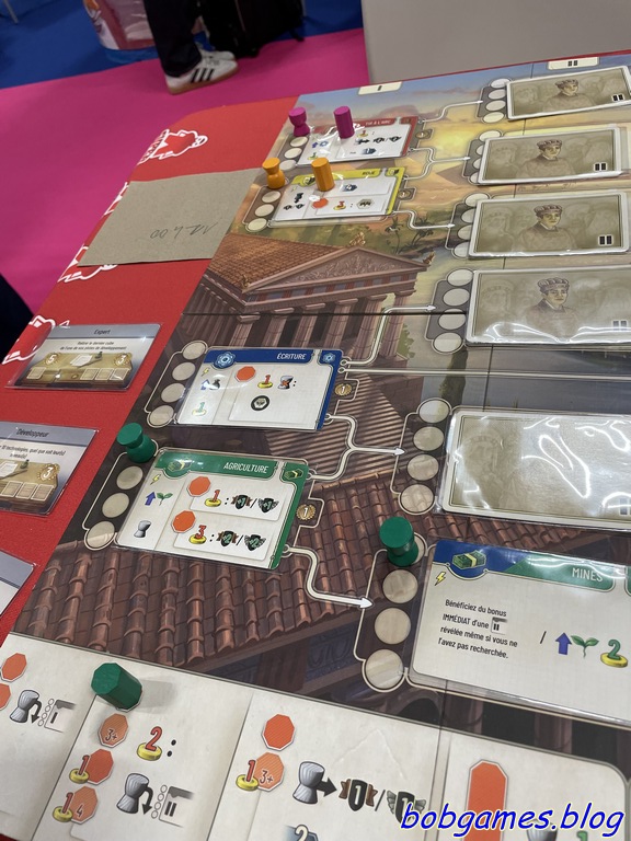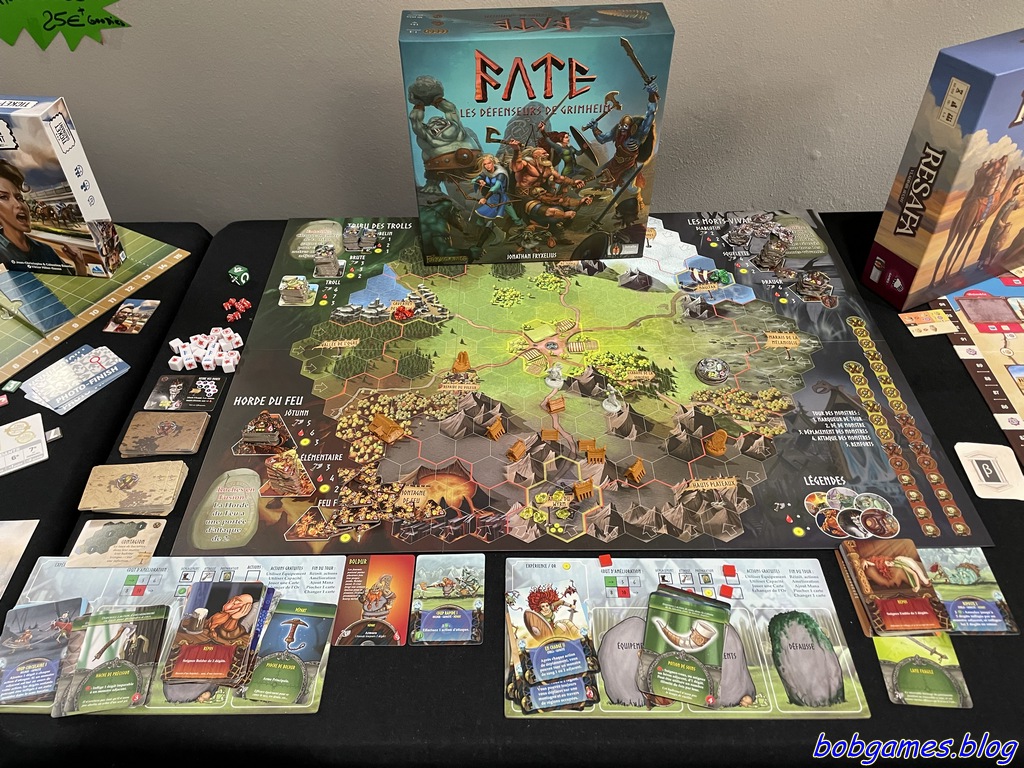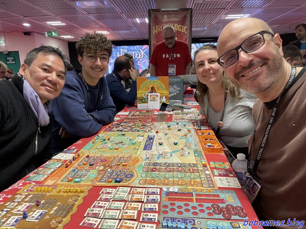 Bilan : Premier gros jeu du festival. Bien que les règles soient assez simples à appréhender, c’est un jeu à multiples possibilités et donc avec une marge de progression très forte. C’est (encore) un jeu de civilisation mais c’est pensé pour durer moins longtemps que certains grands frères justes injouables pour le commun des mortels (coucou Through the Ages). Donc c’est laborieux. Donc on tâtonne au début. Donc la paralysie d’analyse guette. Donc ce n’est pas pour tout le monde, c’est un jeu expert, un vrai. Et il a du potentiel. Partie démo de 2 heures avec les règles. Pas d’achat.