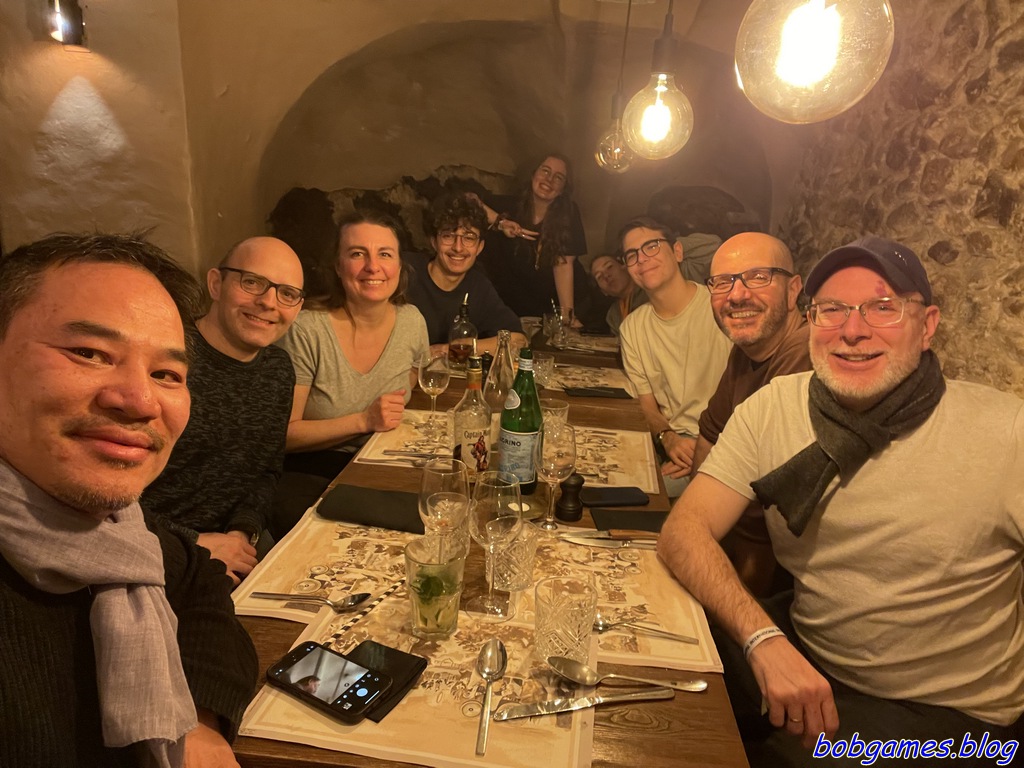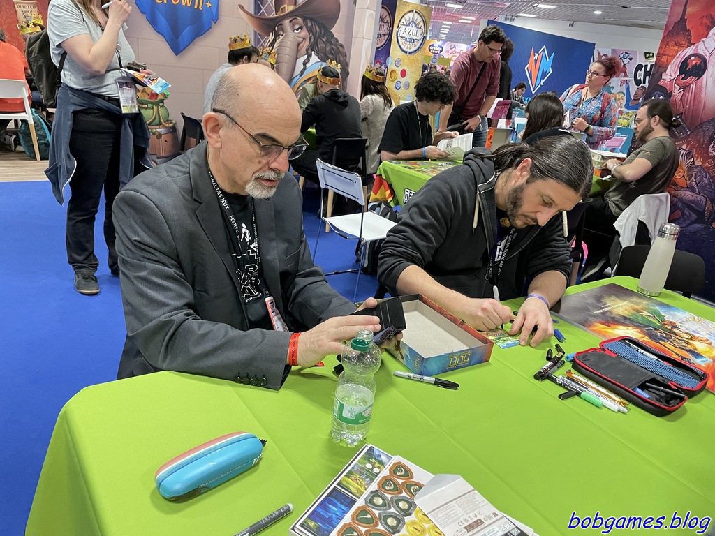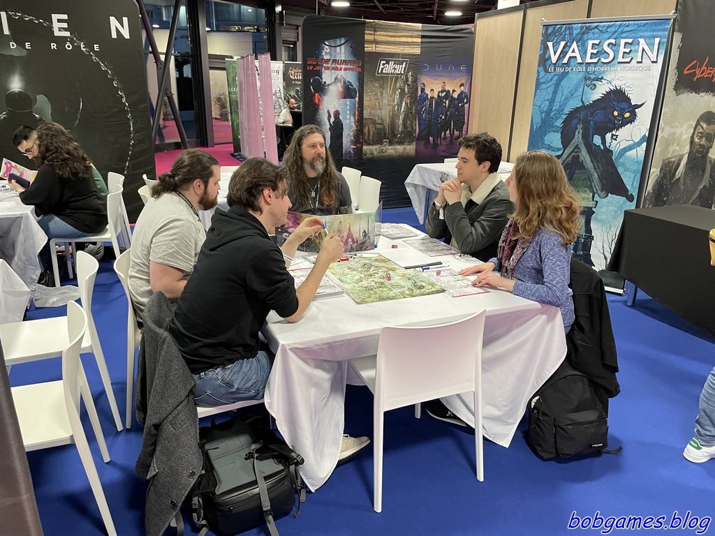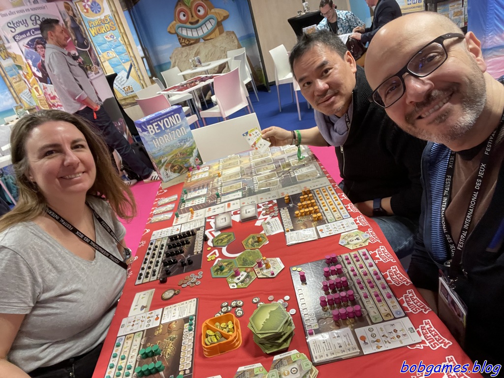 Bilan : Ce qui a été magnifique d’emblée dans ce jeu, c’est que Beyond the Horizon (notre jeu précédent) nous a semblé un jeu pour enfant à la fin de l’explication hyper soutenue des règles par Fanny en 30 minutes chrono (sans reprise de souffle, chapeau). Tout est fait ici pour nous déboussoler (y compris des routards experts comme Minh et moi) : des règles très denses, un plateau hyper chargé et au choix de couleurs discutable pour la lecture du jeu, 1001 possibilités de marquer des points (une vraie salade), une rareté des ressources, un retour incessant dans les règles (merci à notre gentille animatrice d’être restée avec nous lors des premiers tours), une interconnexion des actions pouvant ensuite débloquer tel ou telle autre possibilité et enfin une complexité globale qui nécessiterait 1d20+5 parties pour être parfaitement maîtrisée. Bref. Un GRAND jeu. Un monstre. Une pépite. Mais clairement pas pour tout le monde, oh non. Partie démo de 2 heures avec les règles. Pas d’achat.