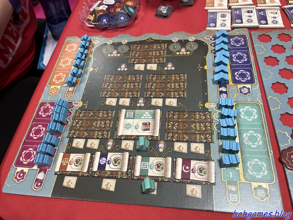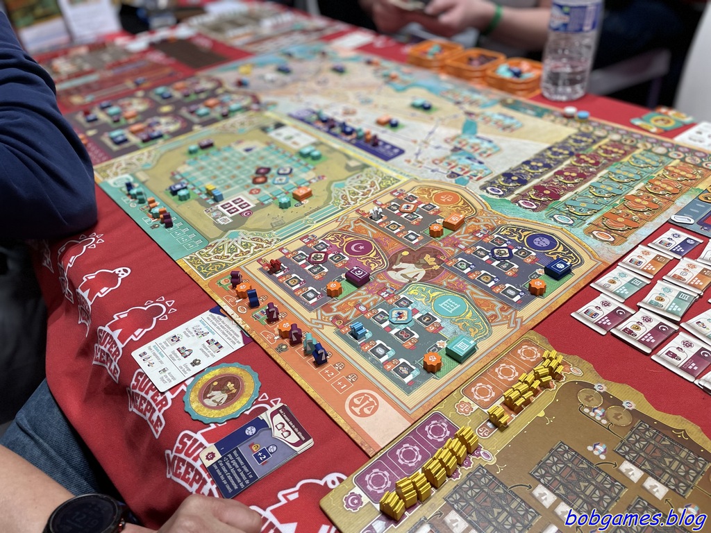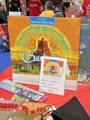 Oh chouette, la table juste à côté se libère en même temps que nous. On embarque maintenant sur un autre gros jeu, le « nommé As d’Or » Sankoré, toujours chez Super Meeple. Une thématique juste incroyablement rafraichissante, le développement de l’université de Tombouctou en 1325.