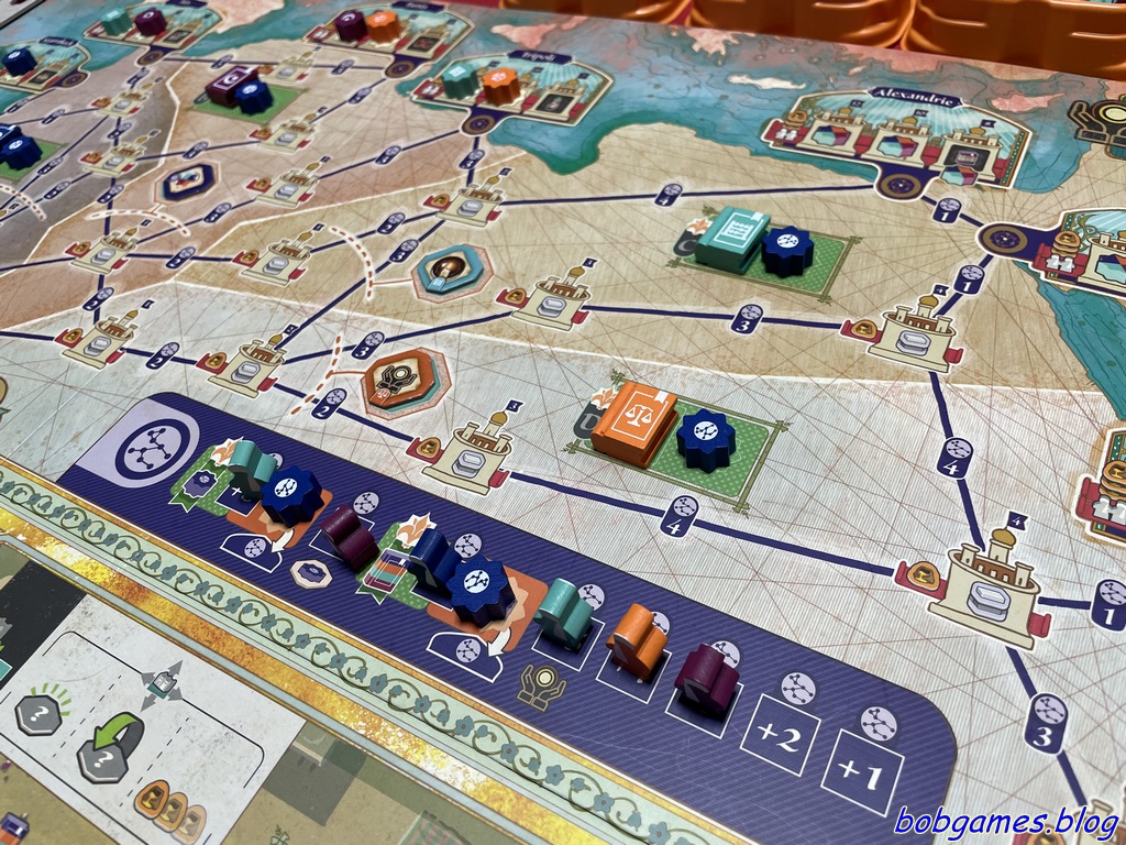 A son tour, on pose son pion action sur une des cases vides du plateau principal. Bien que les actions du début soient limitées, elles vont progressivement s’étoffer en fonction de son avancée dans l’arbre des technologies et du déblocage de nouvelles actions en fonction d’objectifs à réaliser (genre on a accompli 2 colonisations ou une fortification).