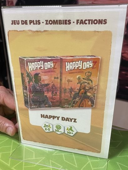 Après 2 jeux aussi touffus, un petit jeu de cartes sur la thématique zombie (encore ?!) nous fera du bien. Retour chez Origames pour Happy Dayz, un jeu qui se vend en 2 boîtes complémentaires (American Dream et Woodstock Fever). Cette fois, on est les humains et on doit survivre aux hordes de zombies.