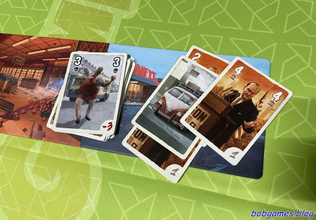 Bilan : Un jeu de plis. Tout est dit. Bien qu’il y ait quelques originalités dans la mécanique et quelques coups bas à se défausser de cartes zombies quand vous le pouvez, au détriment de vos « amis » survivants, ça reste un jeu de cartes auquel on passe un (bon) moment et qu’on oublie rapidement à peine quitté la table. 40 minutes avec les règles à 4 joueurs. Je ne sais même plus qui a gagné… Pas d’achat.