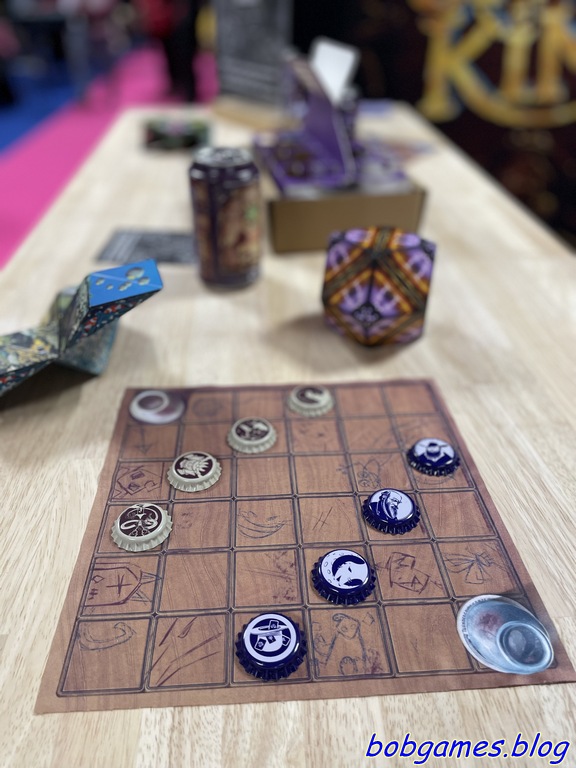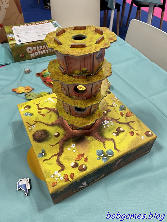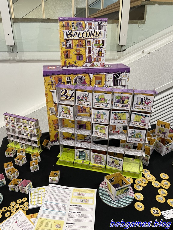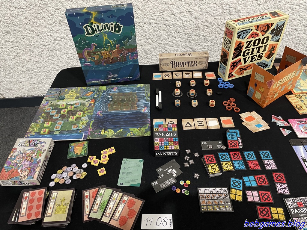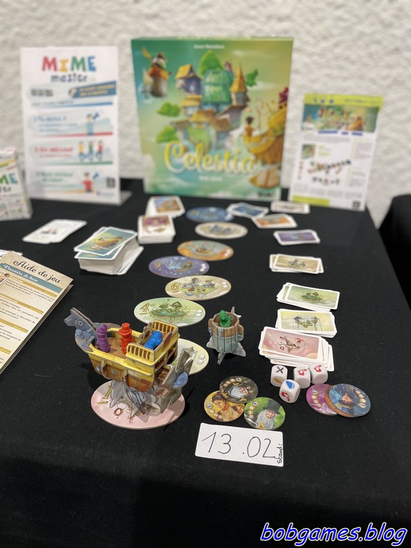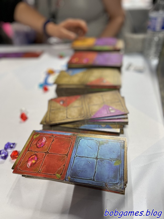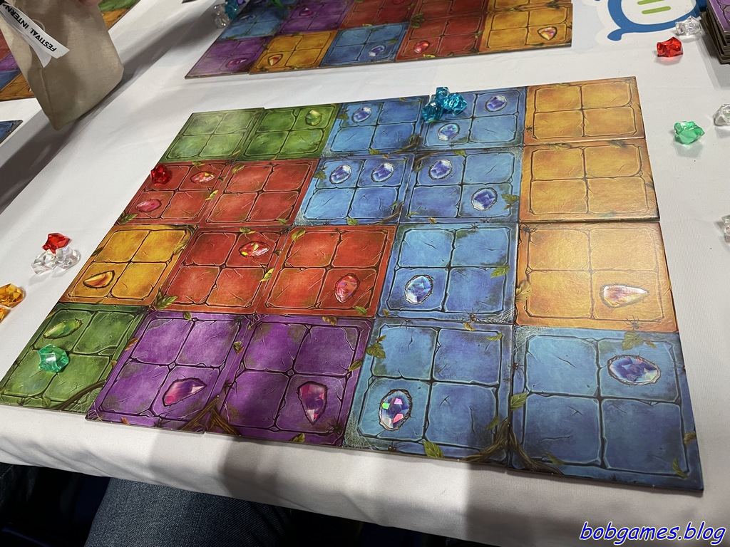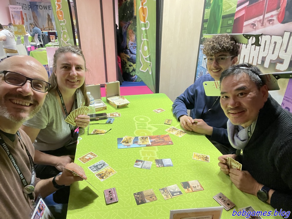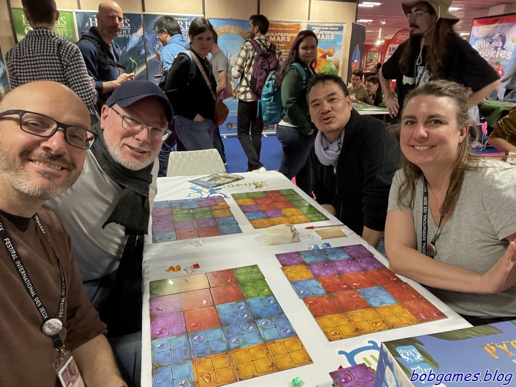 Bilan : Un jeu d’optimisation et d’opportunisme, avec les différentes tuiles à choisir et la gestion des gemmes. C’est pas très esthétique (de gros blocs de couleur…) mais il faut avouer que le jeu fonctionne. Il faut clairement regarder ce que font les autres pour optimiser sa pyramide ou éviter que certains partent sur des couleurs en solo. Le tirage des tuiles donnent son côté chaotique au jeu, tout en laissant une bonne part de jouabilité. Rien d’extraordinaire mais c’est plaisant. Par contre, côté immersion, à part la pyramide qui grimpe, c’est du abstrait pur et dur. 1h10 avec les règles à 4 joueurs. Victoire de Minh (record du festival battu). Pas d’achat.