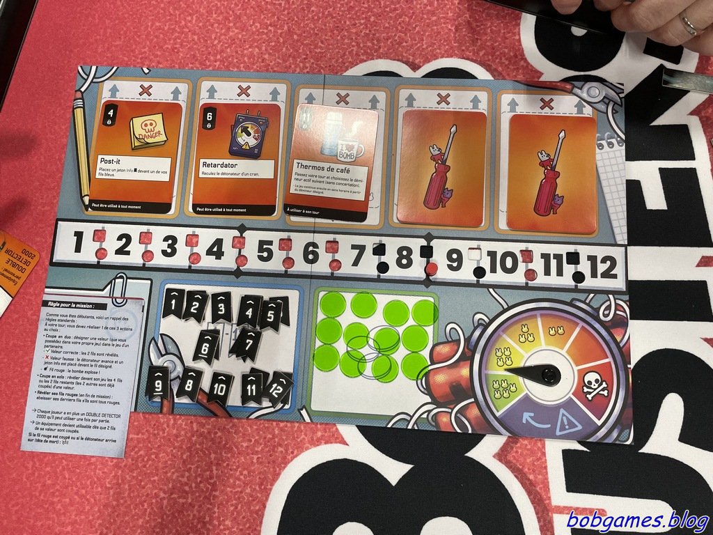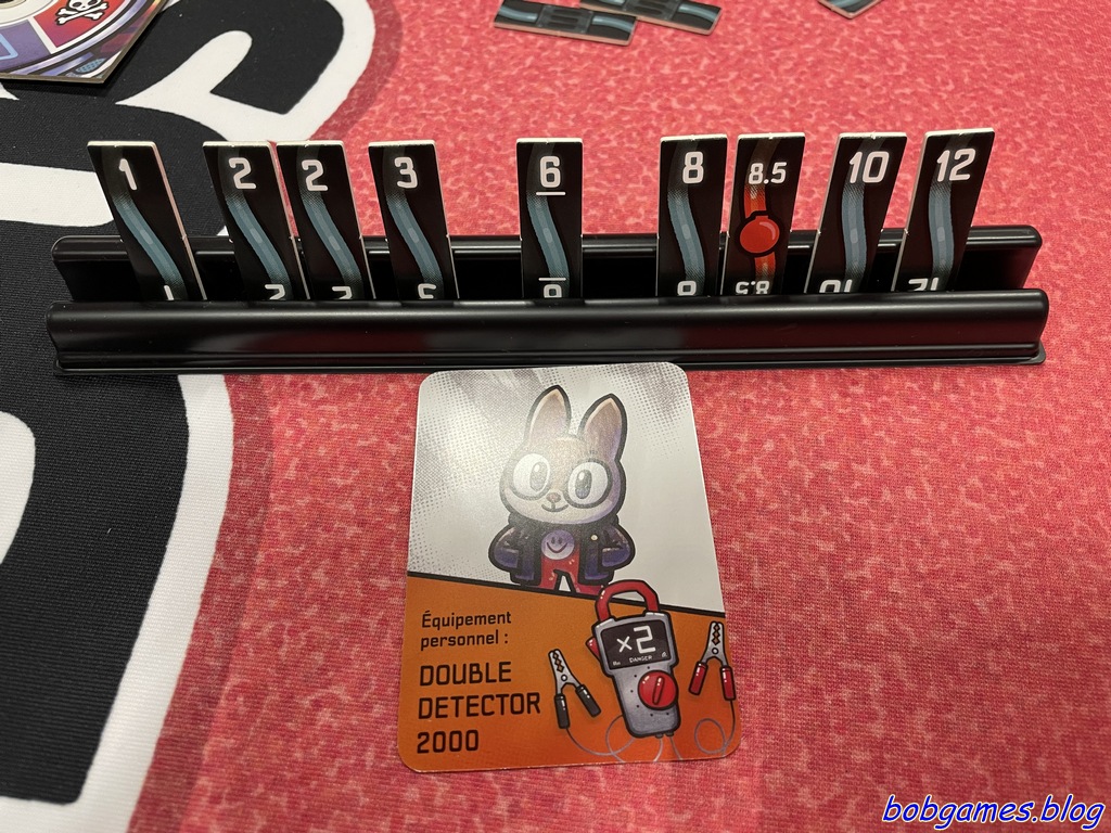 Le principe est simple. On doit donner des indices sur les fils que l’on possède et les autres doivent deviner sans évidemment couper le fil rouge (ici c’est le 8.5 mais le jeu comporte 66 scénarios avec d’autres combinaisons). Il y a des cartes qui viennent faciliter le jeu quand on a réussi certains objectifs.
