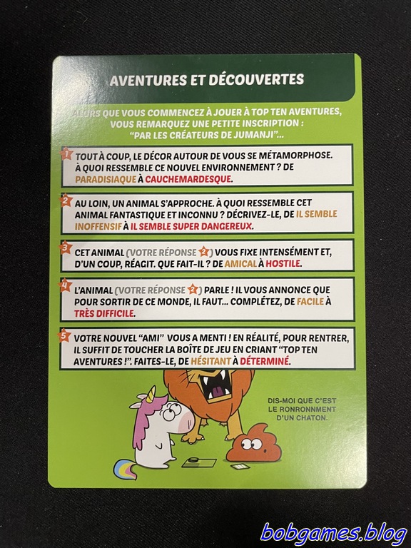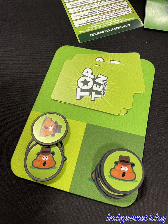 Qui ne connaît pas Top Ten ? Et bien voici une nouvelle variante, Top Ten Aventures chez Cocktail Games. C’est du Top Ten mais scénarisé. Une carte comporte 5 questions et toutes les réponses sont liées.