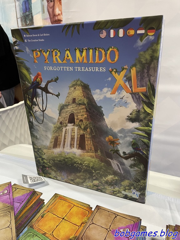17h09. Probablement notre dernier jeu de la journée, étant donné que Pyramido Trésors Oubliés, édité par Synapses Games, doit se jouer en une bonne heure. Bienvenue dans les pyramides d’une tribu disparue depuis longtemps mais dont les vestiges et les richesses nous attirent, comme une sangsue sur un beau corps bien dodu…