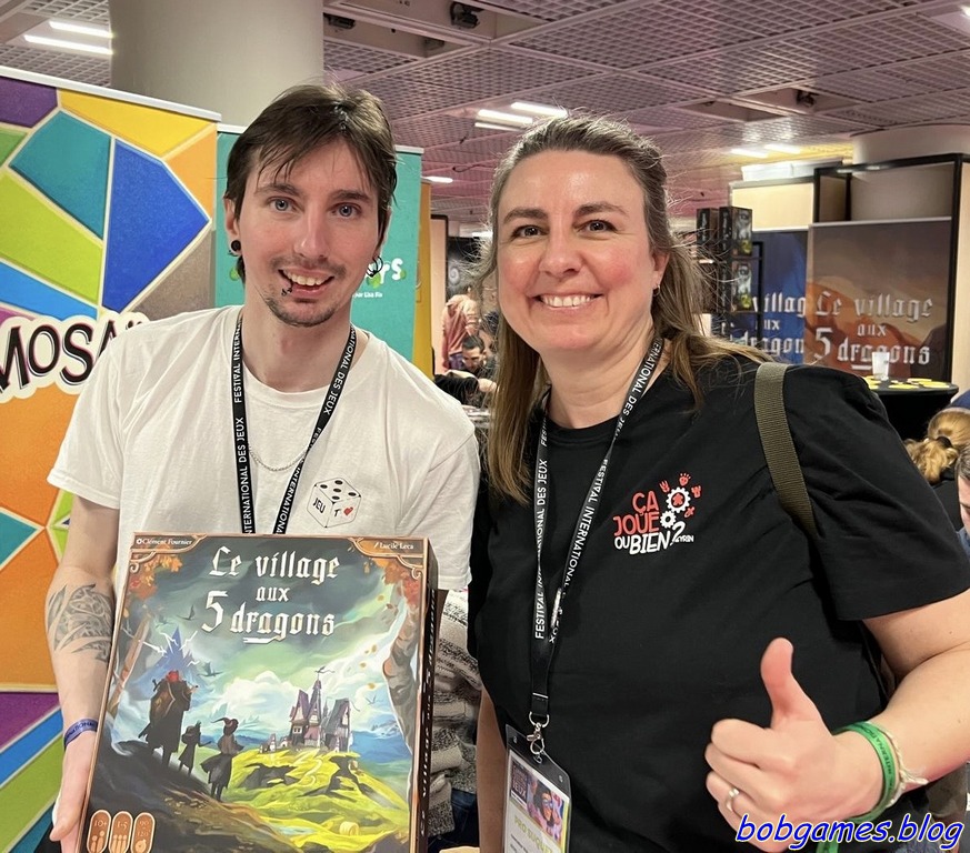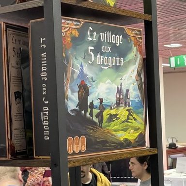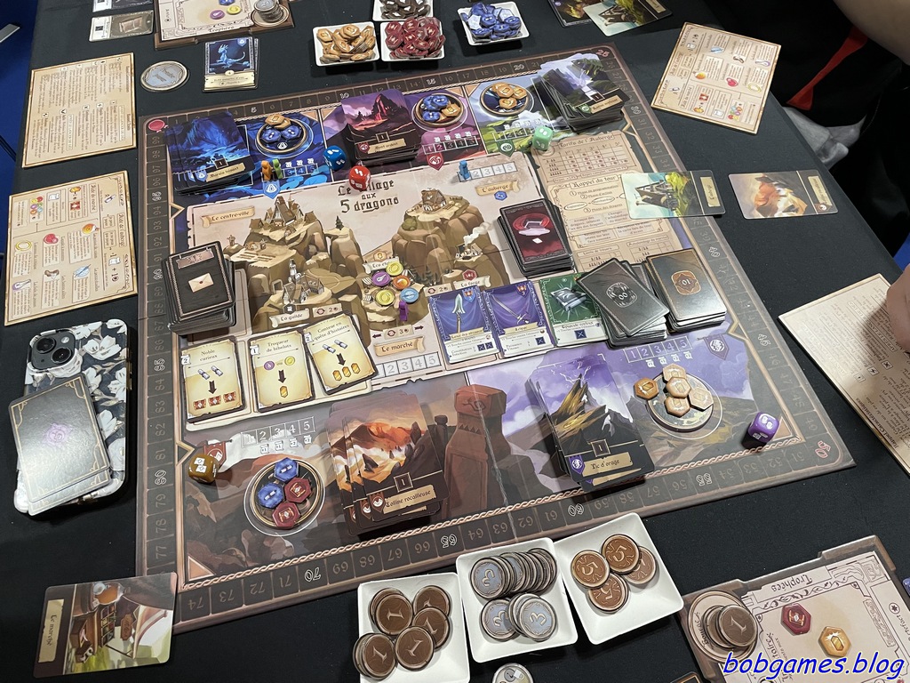 Et ces tables, c’est pour jouer au Village aux 5 Dragons, édité par Jeu T’aime. Un jeu dans un monde médiéval fantastique, inspiré des jeux de rôle, qui nous mène en pleine exploration de 5 tanières à dragons. Heureusement, entre les combats, le fameux village nous accueille avec une splendide auberge et son marché tonitruant.