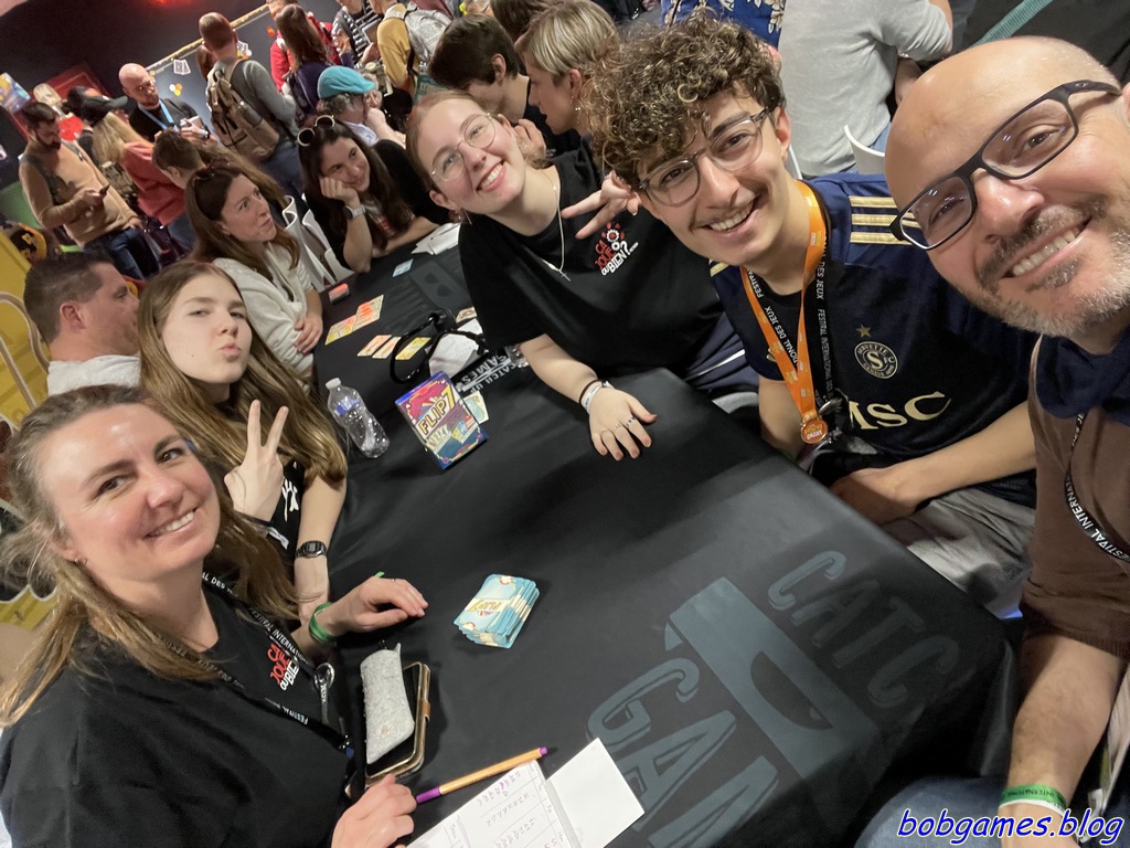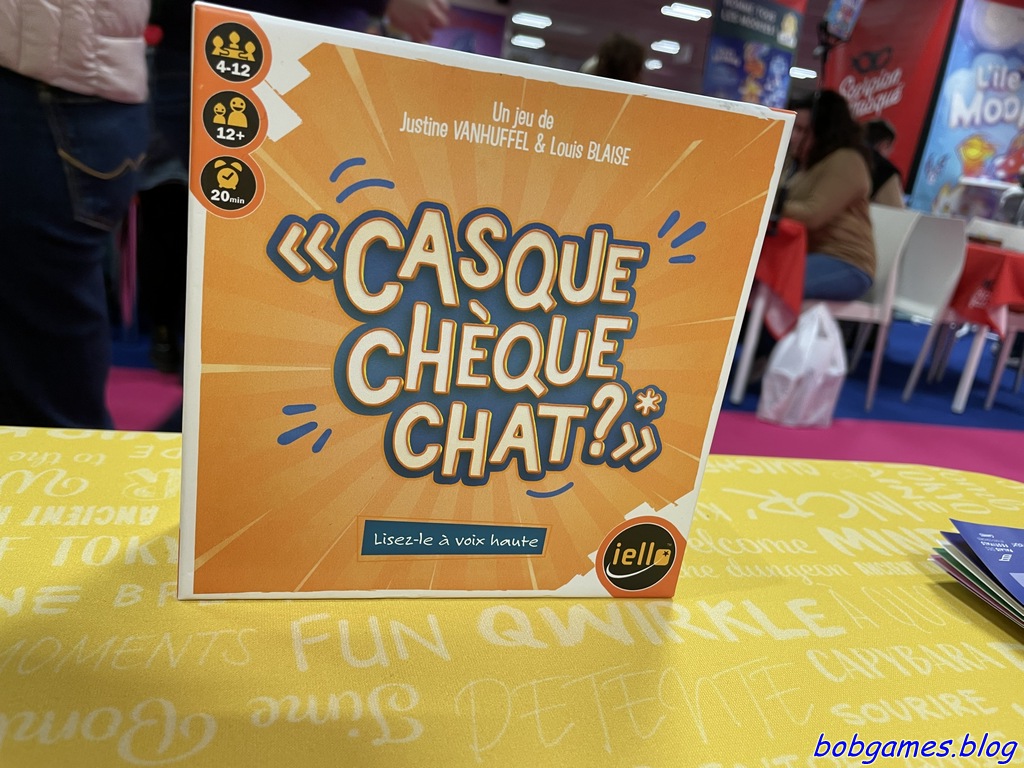 La déambulation nous emmène chez Iello, pour tester un jeu bientôt édité : Casque Chèque Chat ? Répétez cette phrase à voix haute et rapidement. Voilà, vous avez compris le but du jeu : faire deviner des phrases en donnant des mots similaires, pouvant reproduire des syllabes, mais n’ayant aucun lien orthographique.
